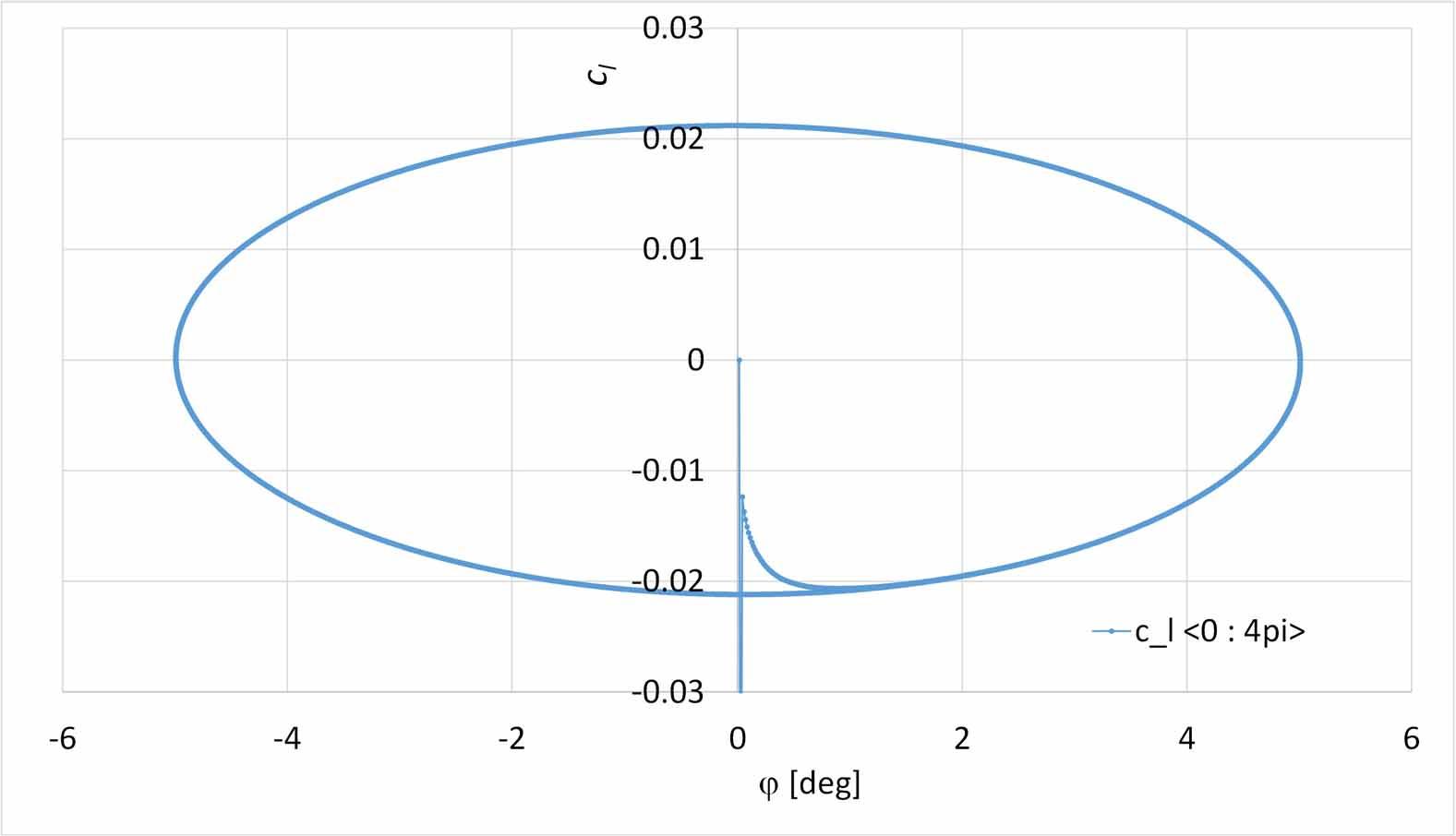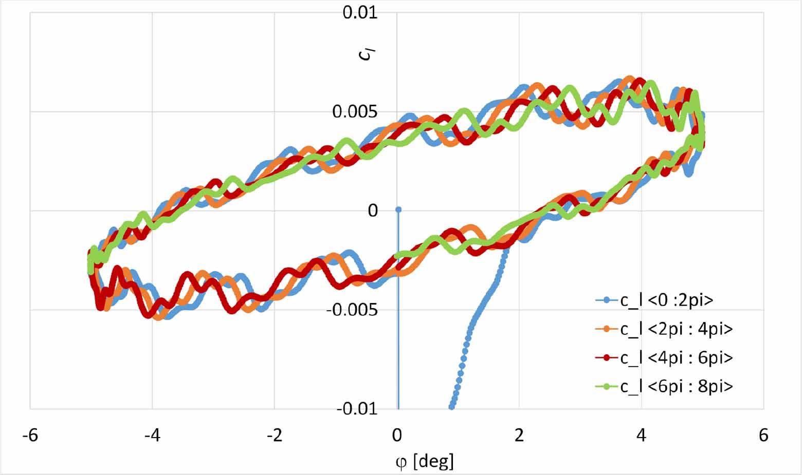 Hysteresis loop of the rolling moment coefficient cl in oscillations at angle of attack α = 4°.