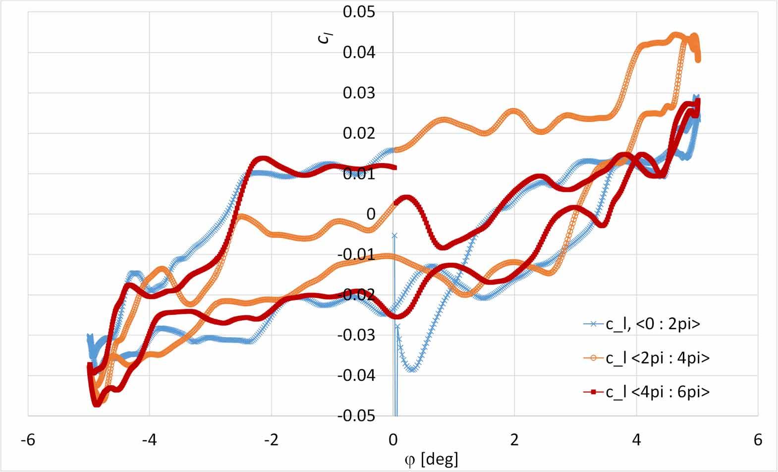 The simulations of harmonic rolling oscillations yield a hysteresis loop of the rolling-moment coefficient as a function of roll angle, and the derivative clp derivative can be obtained using the previously introduced Equations (6), (7) and (12) for the Forced Oscillations Method.