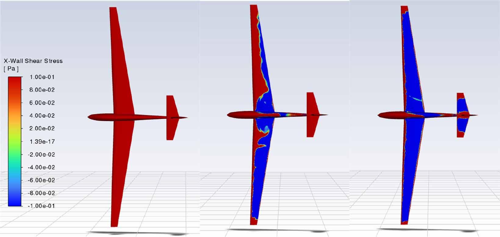 Regions of attached (red) and separated (blue) flow on the glider’s upper surface at angles of attack α = 4°, 15° and 20°, visualized by an appropriate scaling of the wall-shear-stress component in the X-direction (along the fuselage centerline). Results obtained using MRF simulations.