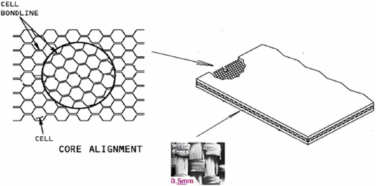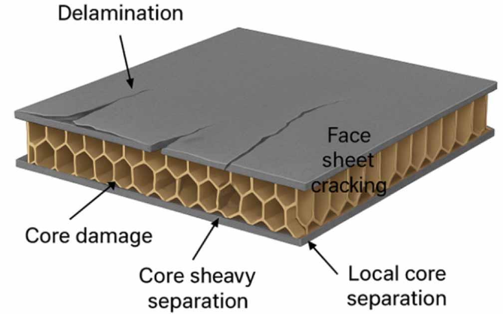 In honeycomb sandwich structures, one of the primary imperfections arises from the limited contact area between the honeycomb core and the skins. Core–skin bonding occurs mainly at the nodal attachment points, where individual honeycomb cells intersect. These nodes largely determine the residual peel strength and initiate the onset and progression of delamination, as clusters of weak nodes form preferential failure paths.