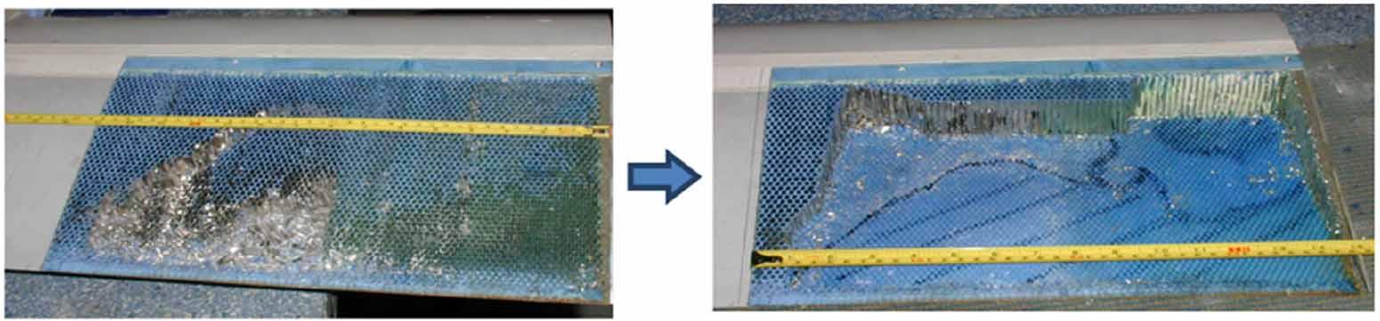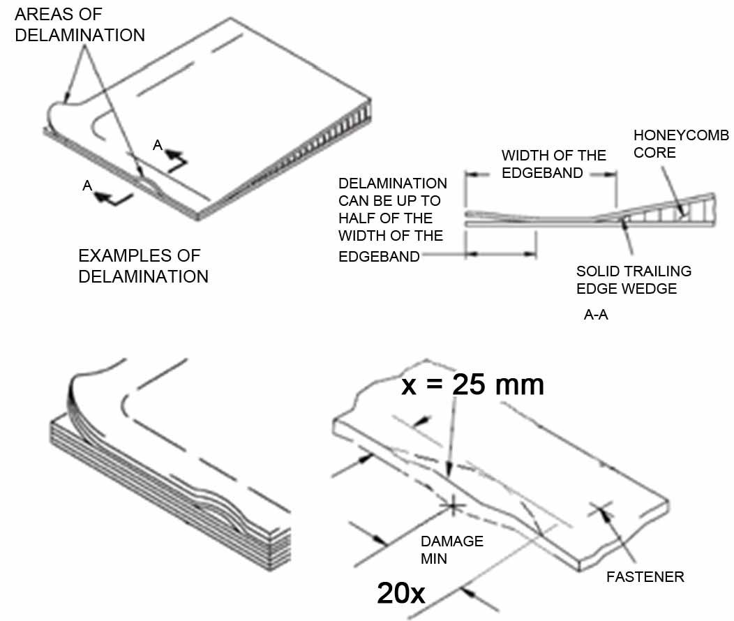 Figure 5 shows the onset and development of delamination in a flap component. At the early stage – before the damage reaches the honeycomb core – the deformation is absorbed partially by the matrix and partially by the composite fibers. While surface damage may appear minor, primary delamination is significantly less critical than the stage at which the process penetrates the honeycomb core. Crucially, once delamination extends into the honeycomb, the ratio of its linear propagation length to the visible width at the exposed skin edge may exceed 20:1. When compared with the skin thickness, this ratio may reach 200:1. This illustrates why subsurface damage in honeycomb composites is particularly dangerous: it can spread over large areas while remaining invisible. Such subsurface damage may take years to develop. Although it can be detected using non-destructive testing (NDT), this requires intensive and costly maintenance procedures. Repairing honeycomb structures is also technically challenging.