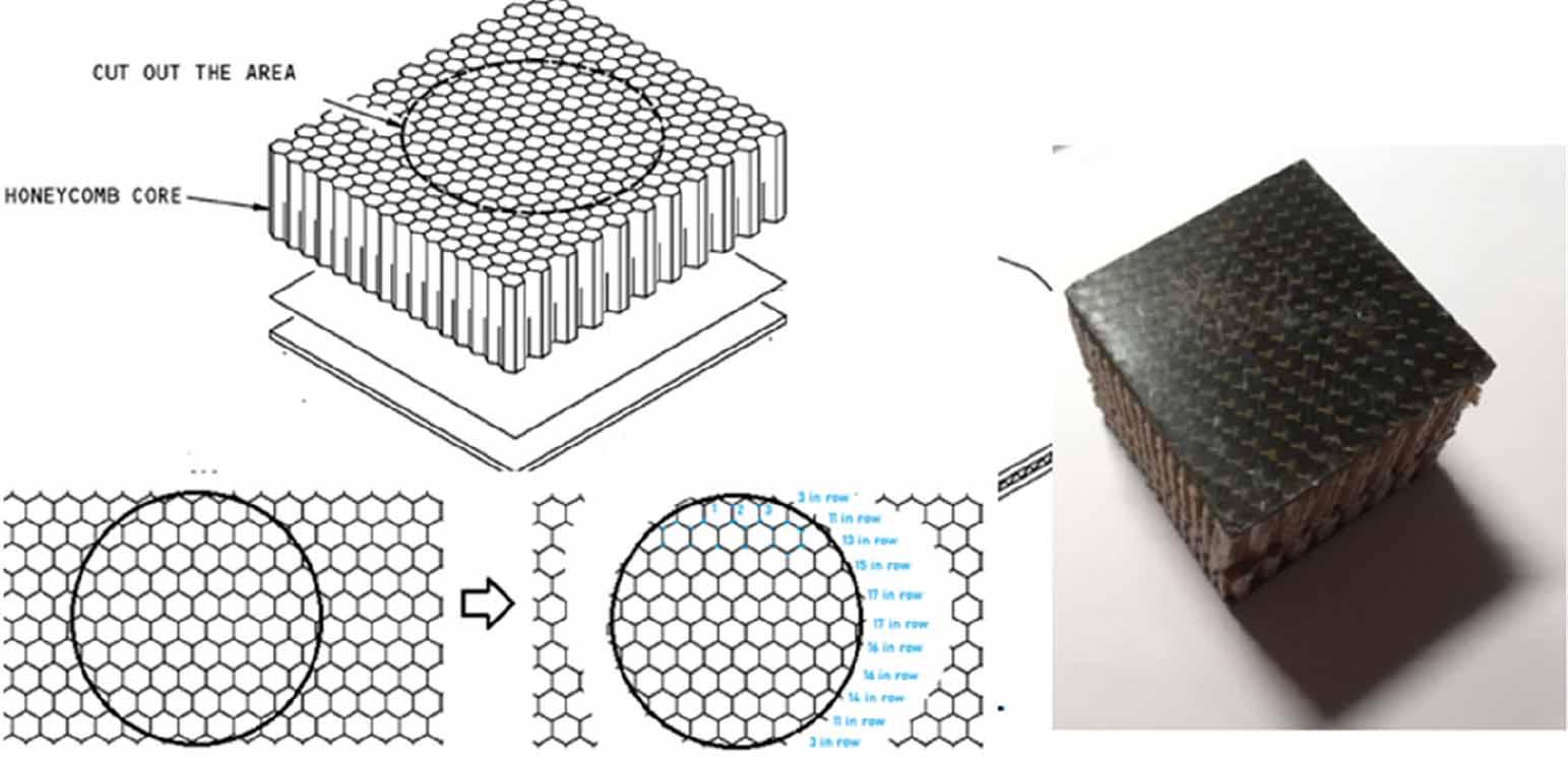 In honeycomb composites, the fabric pattern of the skins and their local thickness variations affect stress distribution and reinforcement behavior. Because the panel as a whole is highly complex, it is impractical to analyze the entire structure directly. Instead, a representative sub-volume of the honeycomb core is extracted and examined as the basis for mechanical and probabilistic modeling. Figure 7 shows an example panel with reinforced sheathing and a corresponding honeycomb fragment selected for analysis.