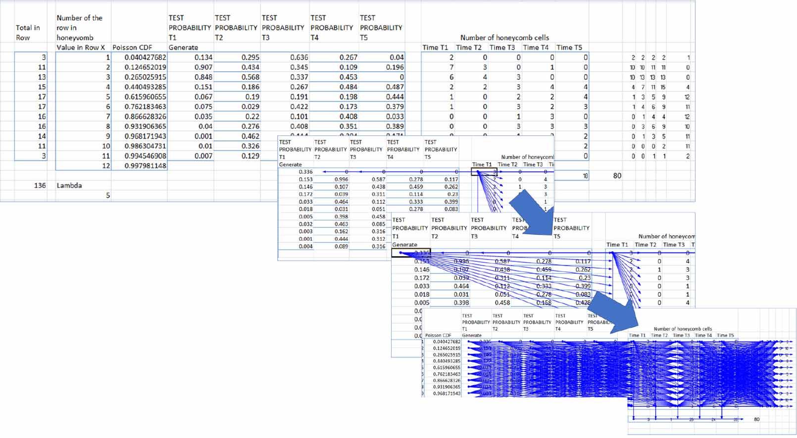 Calculation of the Poisson distribution function and mapping to honeycomb nodes in the Excel model.