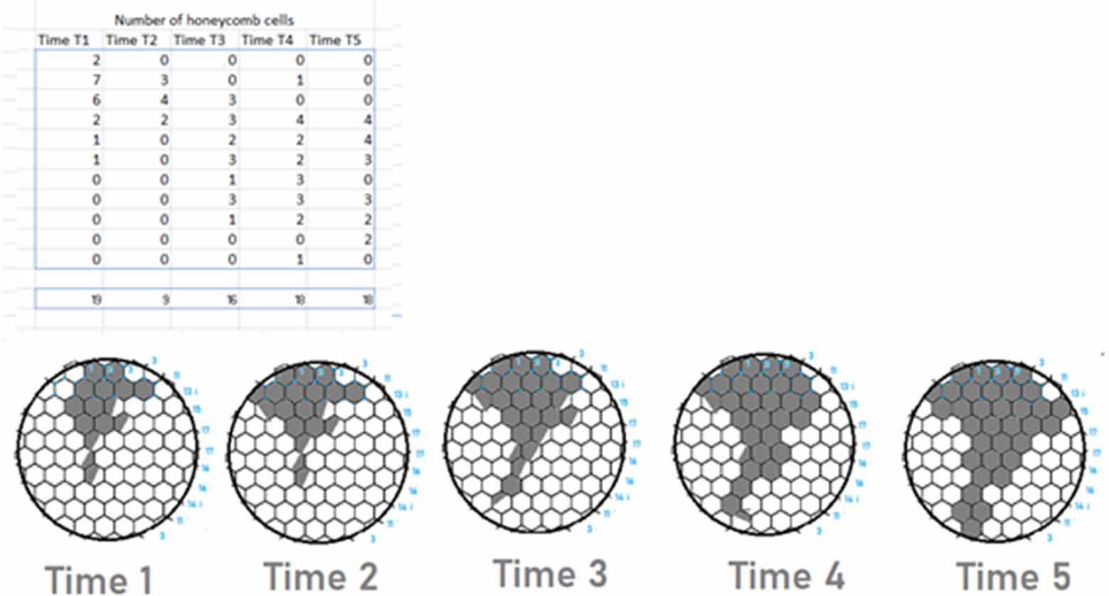 Example visualization of simulated delamination spreading across honeycomb cells.