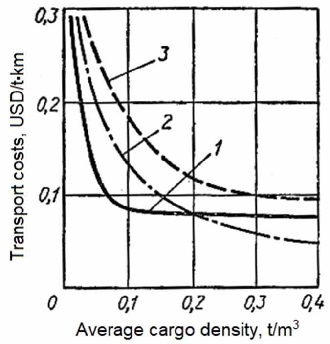 Dependence of transport costs on the average cargo density [9]: 1 – airships; 2 – ground transport; 3 – cargo planes.