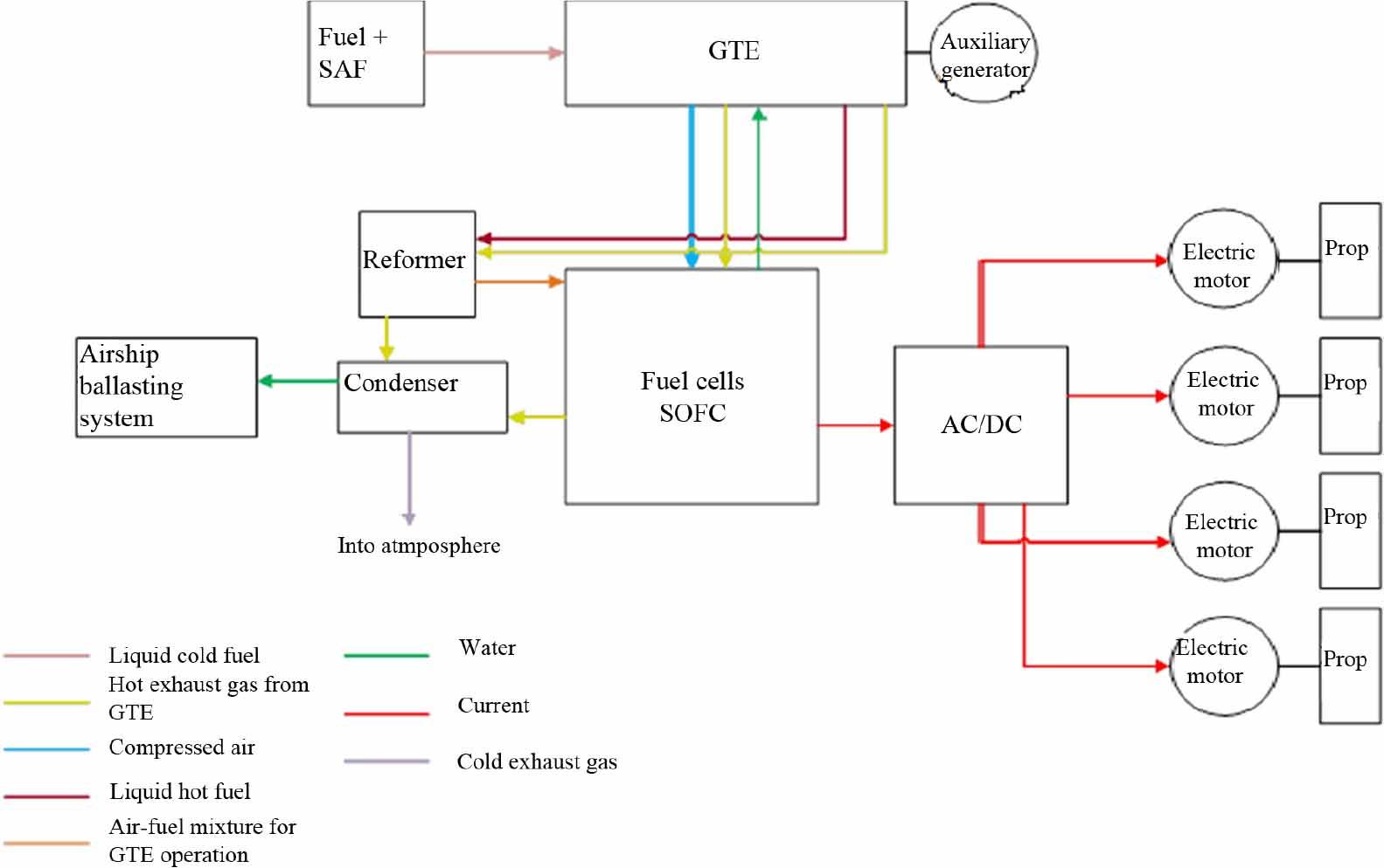 The auxiliary GTE includes a compressor driven by a dedicated turbine. The compressor supplies the compressed air needed for SOFC reactions. A starter-generator connected to the GTE gas-generator rotor serves as an auxiliary electrical generator for the airship’s systems, particularly during phases when full SOFC power is not required.