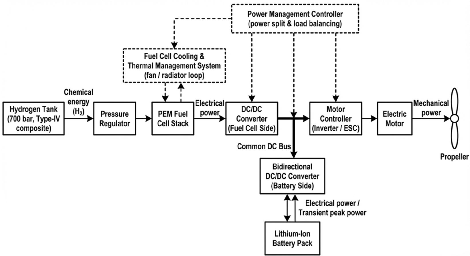 Hydrogen stored in a high-pressure tank is regulated and supplied to a PEM fuel-cell stack, where chemical energy is converted into electrical power. The fuel cell feeds a common DC bus through a DC/DC converter, while a lithium-ion battery connected via a bidirectional DC/DC converter provides transient and peak-power support. A power-management controller governs power sharing and load balancing between the fuel cell, battery, and propulsion motor. Electrical power from the DC bus drives the motor controller, electric motor, and propeller. Auxiliary subsystems such as fuel-cell cooling and power electronics are represented functionally, consistent with the analytical scope of the endurance–range framework.