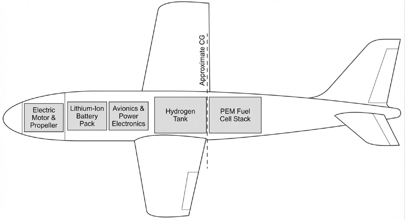 The schematic illustrates the relative placement of major subsystems used for mass and energy accounting, including the hydrogen tank, PEM fuel-cell stack, lithium-ion battery pack, avionics, and electric propulsion unit. Heavier components such as the hydrogen tank and fuel cell are positioned near the aircraft center of gravity to minimize trim variations, while the battery and avionics are located in the forward fuselage and the motor–propeller unit is nose-mounted. The layout is schematic and intended to represent mass-grouping assumptions rather than a finalized hardware configuration.