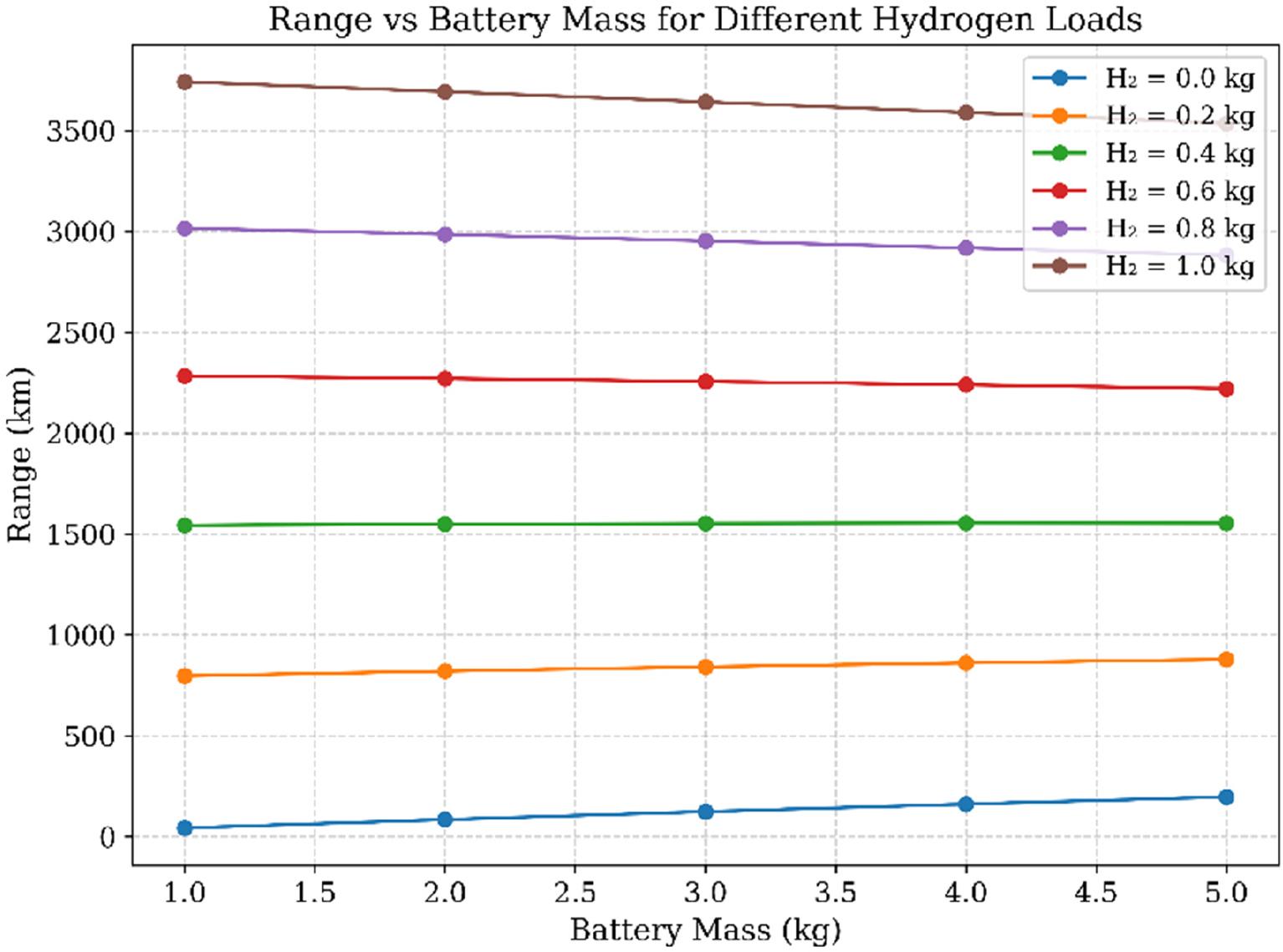 The figure illustrates the combined effect of electrical and chemical energy storage on total flight range. Range increases almost linearly with hydrogen mass, demonstrating the direct contribution of chemical energy to propulsion endurance. Battery mass influences range up to approximately 2 kg, after which structural weight offsets the added capacity. The smooth, monotonic behaviour confirms the consistency of the analytical model.