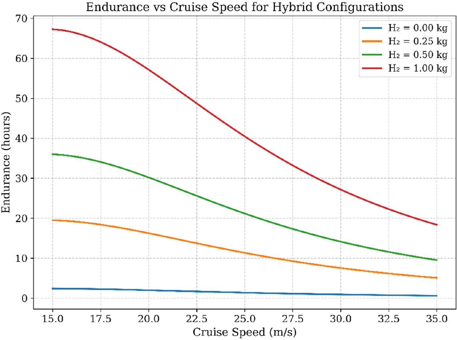 Predicted endurance as a function of cruise speed for multiple hybrid hydrogen–electric configurations.