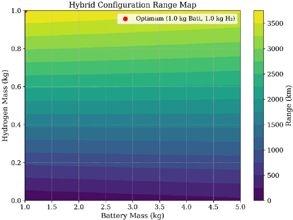 For a representative balanced configuration with approximately 1 kg of battery mass and 1 kg of hydrogen, the analytical model predicts: