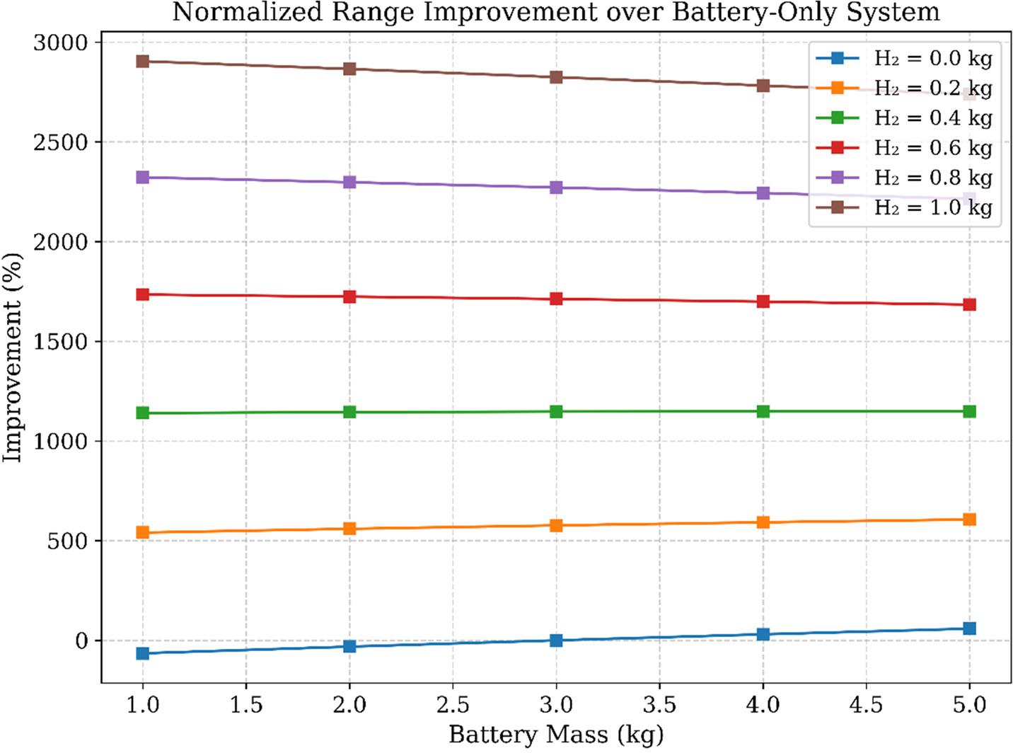 The plot quantifies the relative performance gain resulting from hybridization. Range improvement rises sharply with hydrogen addition, reaching nearly 3000% at 1 kg of hydrogen. The linear trend between improvement and hydrogen mass provides a practical scaling relationship for designers optimizing endurance within mass-limited UAV platforms.