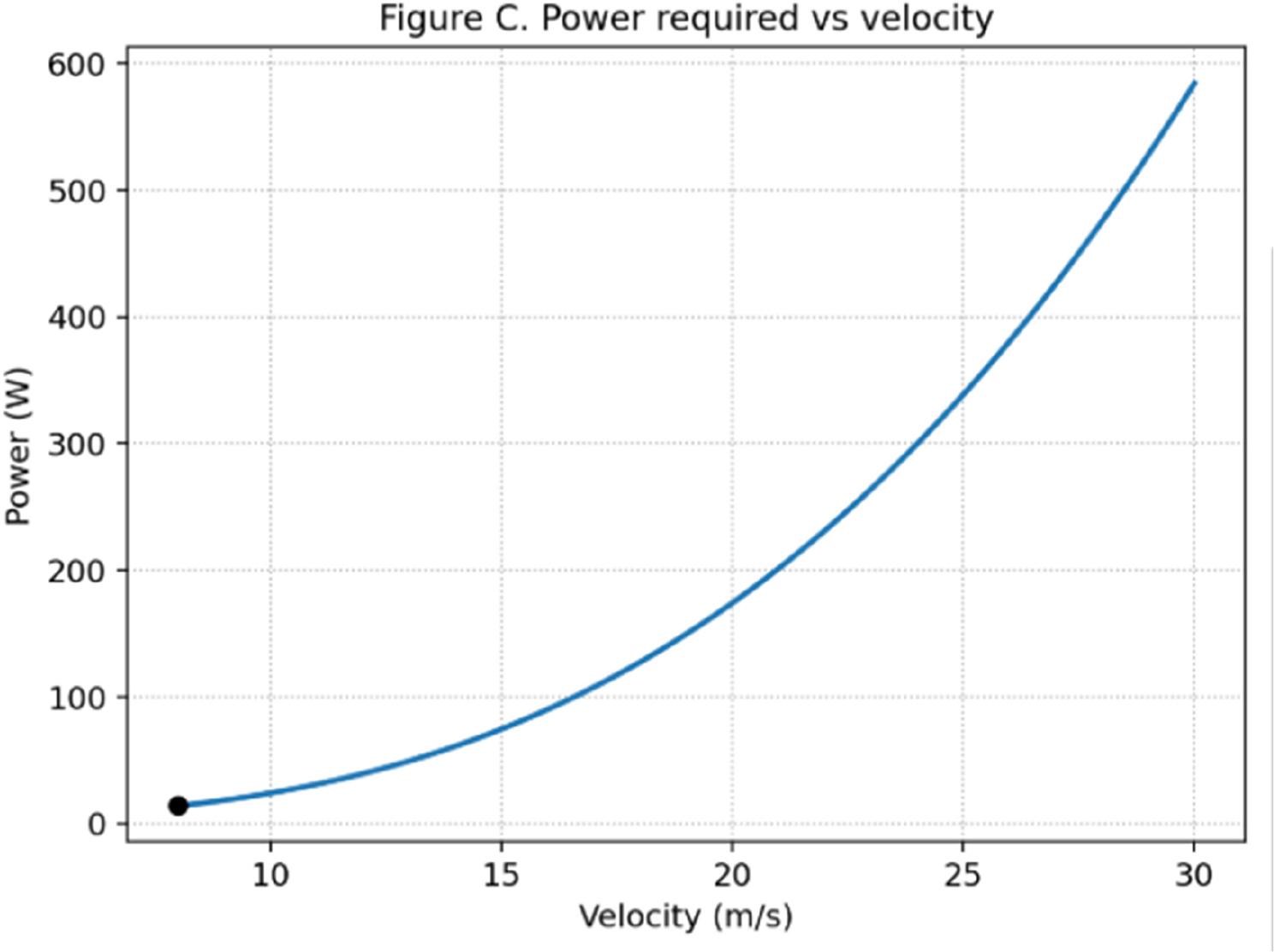The figure illustrates the aerodynamic power demand across the operational velocity range. Power increases approximately with the cube of airspeed, with a distinct minimum-power region at low velocity corresponding to efficient cruise conditions. The predicted cruise-power levels (approximately 0.41–0.46 kW) fall within the typical 0.4–0.6 kW range reported for representative small UAV platforms, such as the DJI Matrice 600. This comparison provides an order-of-magnitude consistency check, indicating that the aerodynamic and propulsion assumptions adopted in the model remain physically reasonable for the UAV class considered.