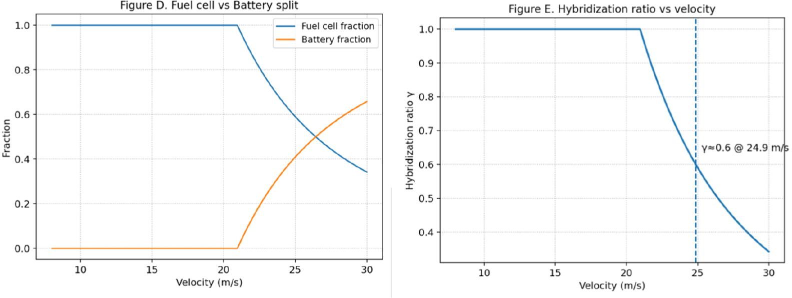 Hybridization ratio (γ) as a function of cruise velocity. The hybridization ratio, defined as the fraction of required propulsive power supplied by the fuel cell, remains close to unity at low speeds and decreases smoothly with increasing velocity as battery contribution rises. Values around γ ≈ 0.6 indicate a balanced hybrid operating regime in which battery loading is moderated while efficient utilization of the fuel cell is maintained. The smooth, monotonic trend reflects the internal consistency of the energy-sharing formulation adopted in the analytical model.