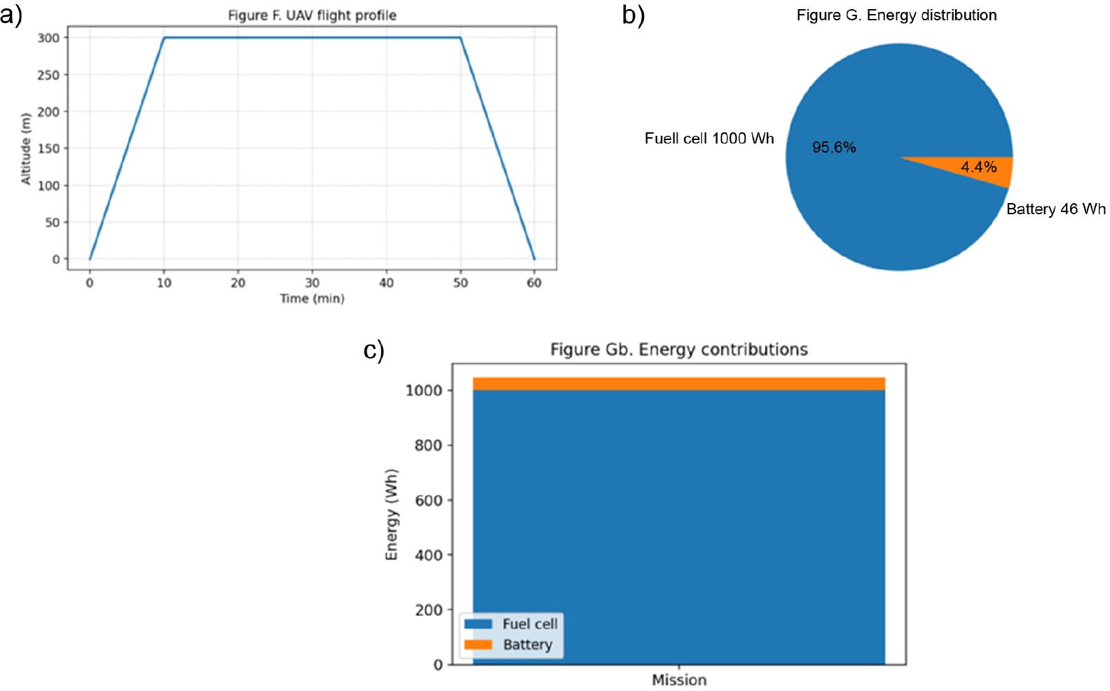 To examine the qualitative behaviour of the analytical framework over an entire flight segment, a representative climb–cruise–descent mission profile was evaluated, as illustrated in Figure 9a. The prescribed altitude trajectory reflects a canonical micro-UAV mission envelope and is intended to provide a consistency check on energy utilization rather than a detailed trajectory optimization. The corresponding energy-use trends align with expectations for a low-power, endurance-oriented UAV operating under steady cruise assumptions. Figures 9b and 9c summarize the relative contribution of hydrogen and battery energy over the simulated mission. Within the assumptions of the analytical model, hydrogen supplies the dominant fraction of total usable energy exceeding 95% in the examined case while the battery contributes a smaller but functionally important share associated with transient and peak power demands. This outcome reflects the large disparity in specific energy between hydrogen (≈120 MJ kg-1) and lithium-based batteries (≈0.8 MJ kg-1) and is consistent with the conceptual role assigned to each energy source in the hybrid architecture. The resulting energy-partitioning behaviour is smooth and physically interpretable, indicating that the model maintains internal consistency when extended from steady cruise analysis to a simplified mission-level scenario. While no direct experimental comparison is implied, the trends observed here are qualitatively consistent with those reported in the literature for hydrogen-assisted hybrid UAV concepts. Within the conceptual scope of the present study, this analysis provides further confidence that the analytical framework captures the essential mass–energy interactions governing hybrid UAV endurance without reliance on numerical tuning or empirical calibration.