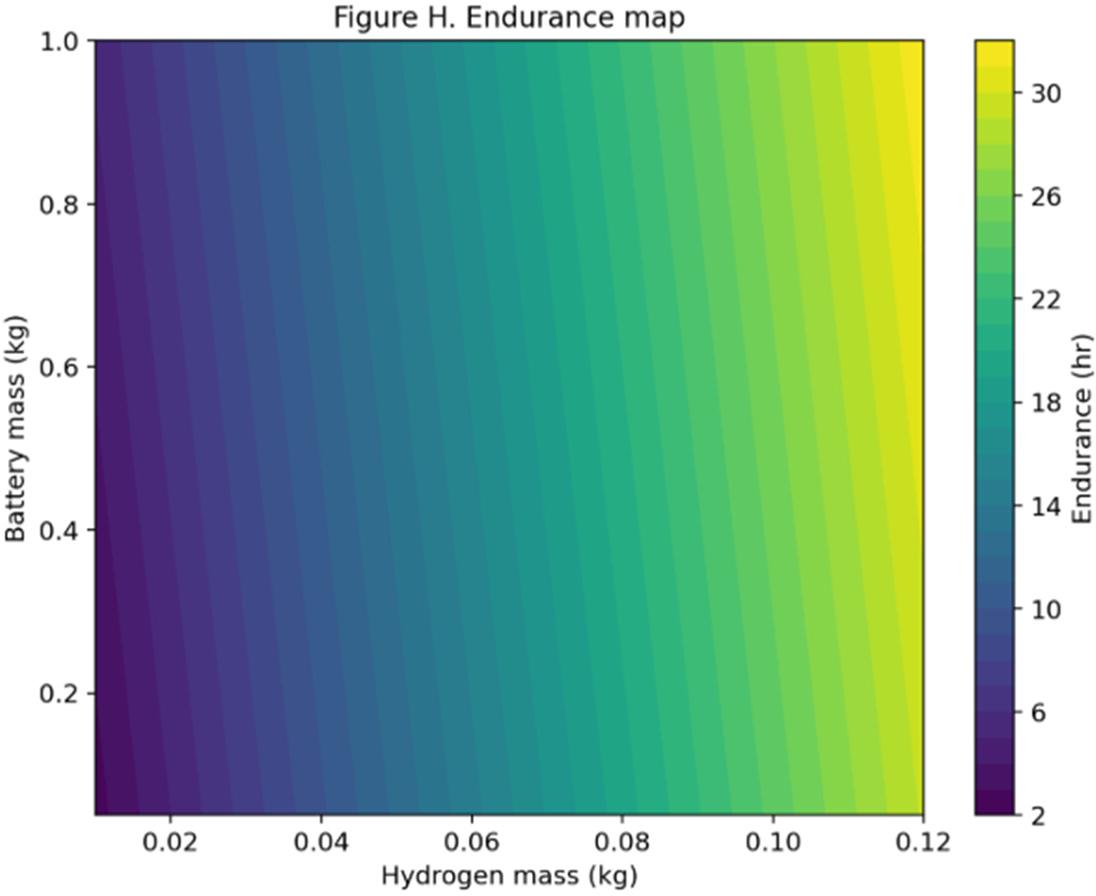 The contour surface illustrates how endurance varies across feasible combinations of battery and hydrogen mass. Endurance increases smoothly with hydrogen loading and exhibits diminishing returns for battery-dominated configurations. The absence of numerical irregularities indicates stable analytical behaviour, while the observed scaling trends are consistent with first-principles expectations for hydrogen-assisted long-endurance UAV concepts.