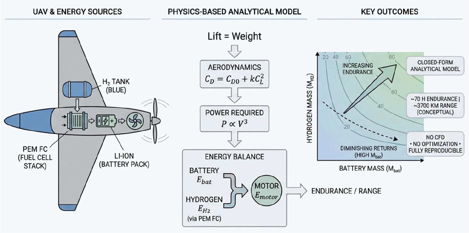 The analytical framework developed in this study is intentionally designed to be lightweight, fully physics-based, and reproducible using only fundamental aerodynamic and energetic relationships. The model relies on a minimal set of input parameters such as lift–drag coefficients, propulsive efficiencies, and the specific energies of onboard storage systems that are typically available from standard UAV specifications or early-stage design estimates. This emphasis on simplicity ensures that the framework remains accessible and transparent, making it well suited for conceptual design studies without requiring CFD, high-fidelity simulations, or proprietary software tools. The central objective of the framework is to express flight endurance and range in closed analytical form by directly coupling aerodynamic performance with the energy available from a hybrid hydrogen–electric propulsion system. All governing relationships are derived from first-principles physics rather than empirical curve fitting or regression-based approximations. As a result, the model exhibits deterministic behaviour and yields results that are physically interpretable, allowing clear insight into how aerodynamic characteristics and energy-storage parameters influence overall UAV performance.