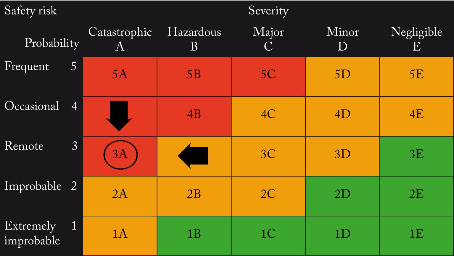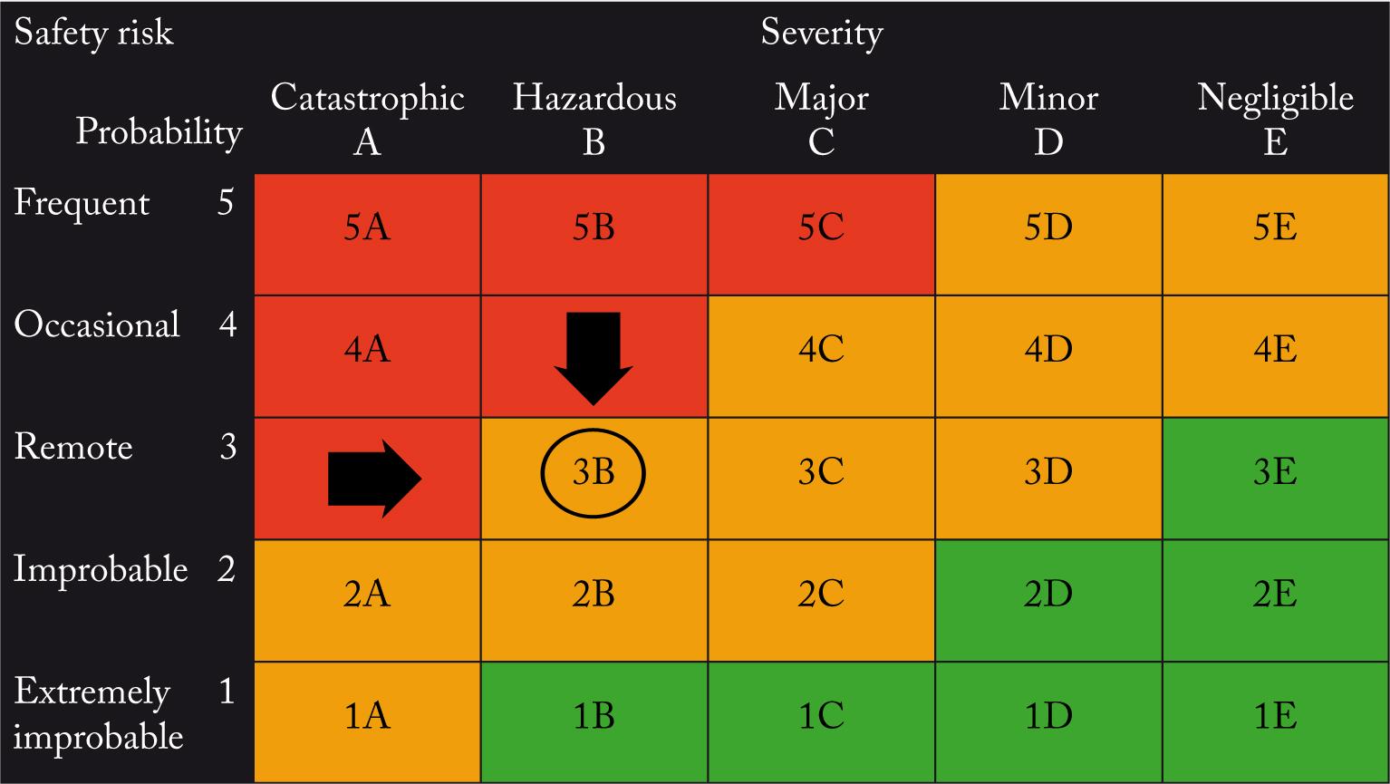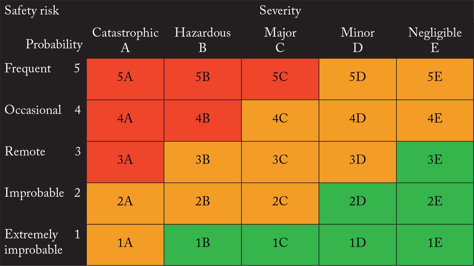 Risk is assessed and categorized in aviation based on two values, severity and probability of occurence, subdivided into five categories. When both values are defined for a specific event, they are plotted in a risk matrix, where their intersection defines tolerance (Figure 1). The tables below present the underlying scales, followed by the graphical matrix (Table 2,3; Figure 1).