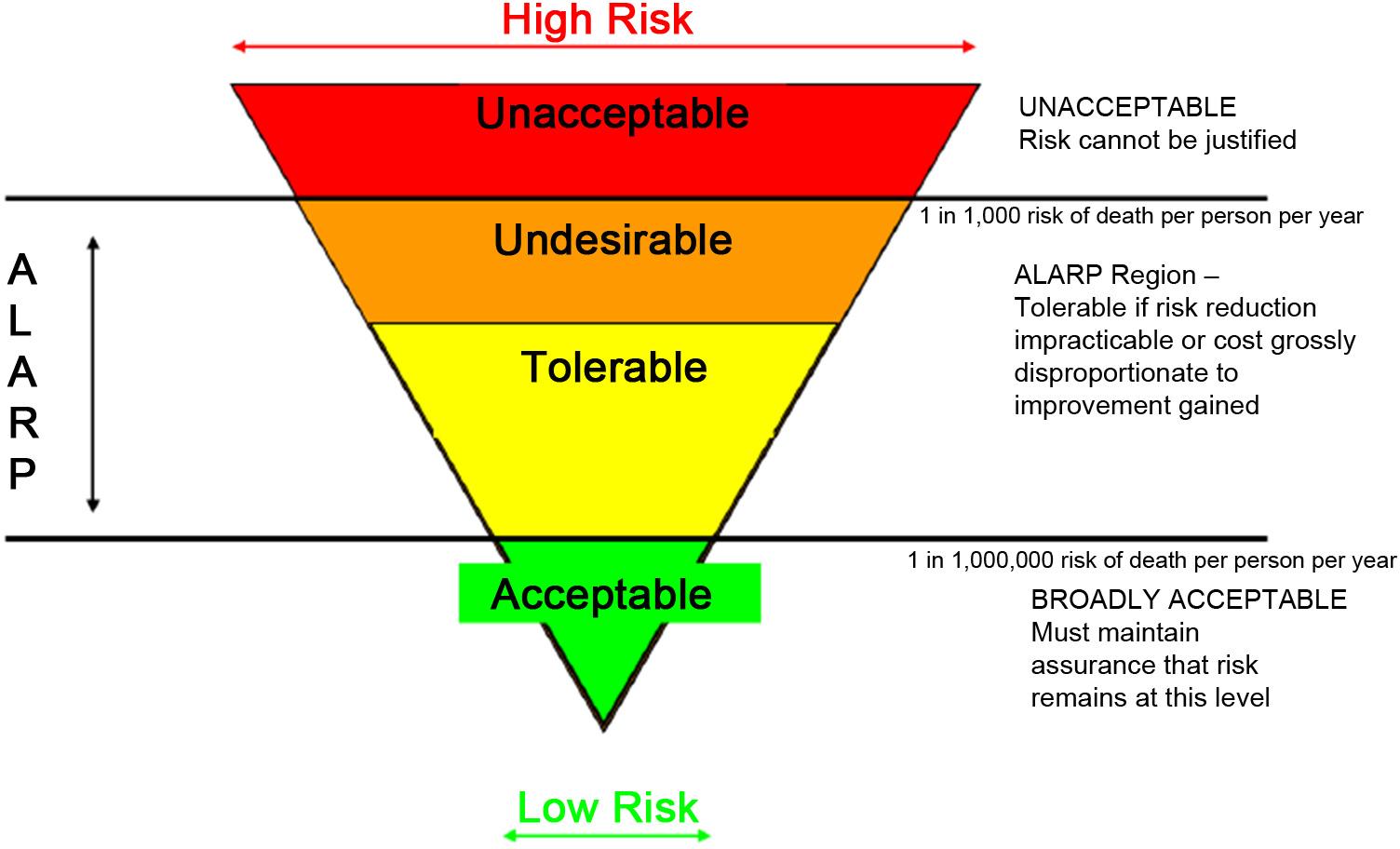 In the UK health and safety system, the ALARP principle (As Low As Reasonably Practicable) is used to classify risk in relation to cost, benefit, and likelihood of occurrence [19, 21]. Here, “reasonably practicable” refers to a comparison between the magnitude of risk and the sacrifice (in terms of cost, time, or effort) required to reduce it, such that mitigation is expected unless the sacrifice would be grossly disproportionate to the risk reduction achieved [20]. Following that principle, assessment may rely on quantitative methods where sufficient data exist, or on qualitative judgment supported by expert knowledge when such data are unavailable.