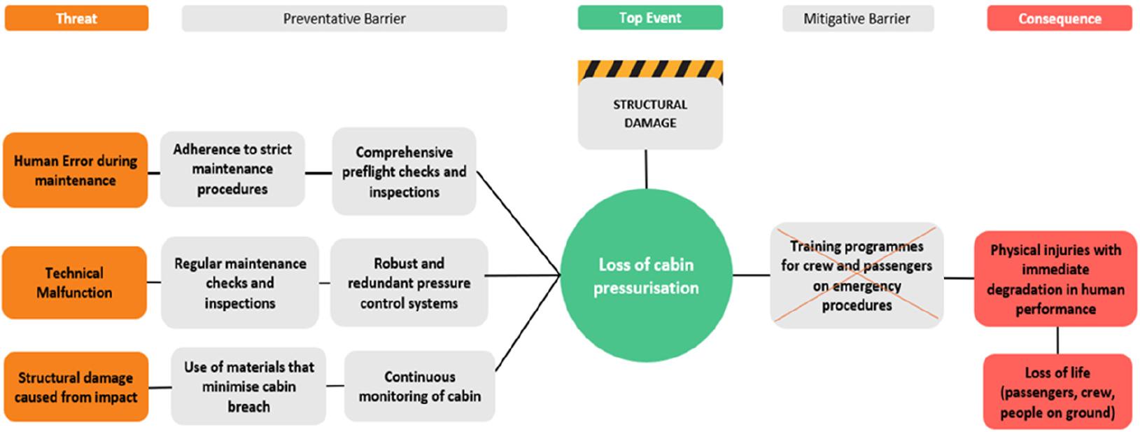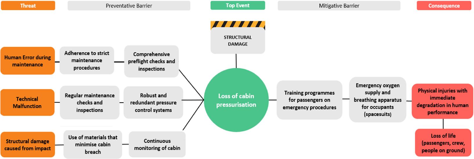 In this assessment, preventive barriers (e.g., structural redundancy, maintenance procedures, system monitoring) are primarily intended to reduce the likelihood of the top event, while mitigative barriers (e.g., emergency oxygen supply, protective equipment, training) are intended to reduce consequence severity following event occurrence. This distinction aligns with established Bowtie methodology and supports clearer reasoning about how specific controls influence different aspects of risk exposure, rather than providing generalized safety assurance.