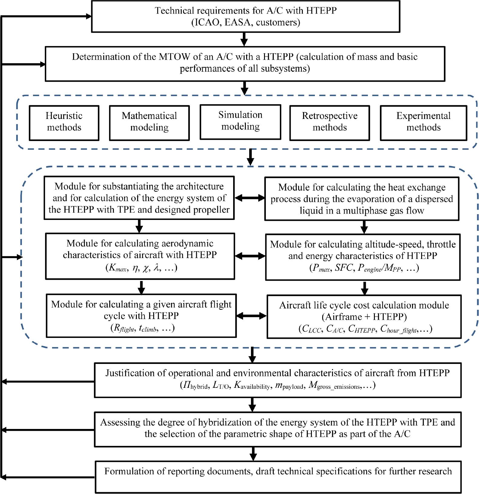 To investigate the performance of the energy system of a modern hybrid power plant (HPP), the existing methodology and models were refined to determine the parametric and technical configuration of a hybrid turboelectric power plant (HTEPP) incorporating a turboprop engine (TPE) for a passenger aircraft. The overall scientific and methodological framework of the study is presented in Fig. 1.