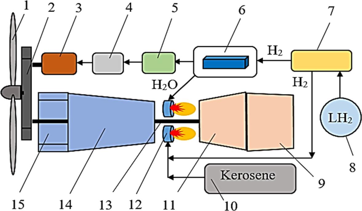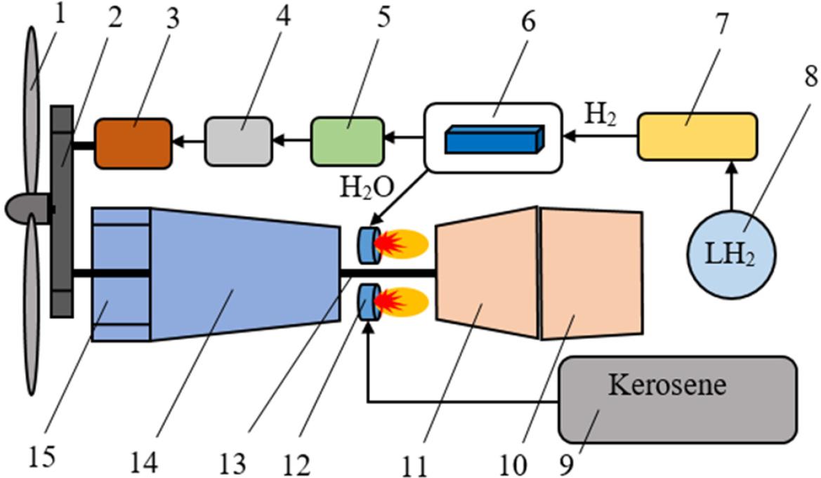 Scheme 1 of an HTEPP with a turboprop engine (using kerosene, liquid hydrogen for the combustion chamber and the FC): 1 – Propeller; 2 – Gearbox; 3 – Electric motor; 4 – Power control and distribution system; 5 – Battery; 6 – Power unit with FC; 7 – Hydrogen evaporator; 8 – Liquid hydrogen tank; 9 – Exhaust; 10 – Hydrocarbon fuel tank; 11 – Turbine; 12 – Combustion chamber; 13 – Engine shaft; 14 – Compressor; 15 – Air intake.