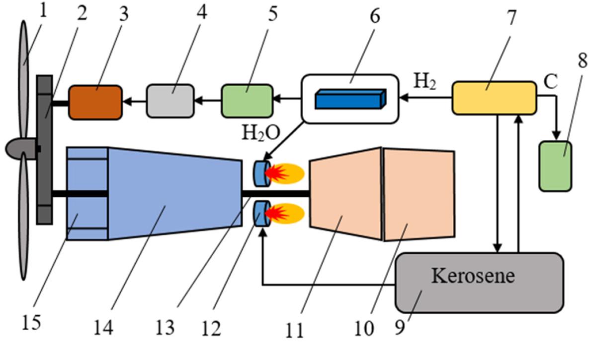Scheme 3 of an HTEPP with a turboprop engine (with hydrogen conversion from kerosene for FC supply): 1 – Propeller; 2 – Gearbox; 3 – Electric motor; 4 – Power control and distribution system; 5 – Battery; 6 – Power unit with FC; 7 – Steam reforming plant; 8 – Soot trap; 9 – Hydrocarbon fuel tank; 10 – Exhaust; 11 – Turbine; 12 – Combustion chamber; 13 – Engine shaft; 14 – Compressor; 15 – Air intake.