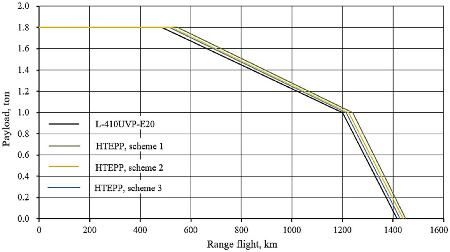 As shown in Fig. 6, the increase in flight range achieved through the use of the HTEPP energy system is relatively modest. The extension of the maximum range of the upgraded aircraft equipped with the HTEPP according to Scheme 1 is primarily attributed to the increased onboard energy reserve resulting from the combined use of hydrogen fuel, hydrocarbon fuel, and electrical energy stored in the batteries. However, this improvement in range is partially offset by the increase in aircraft takeoff mass associated with the additional energy system components.