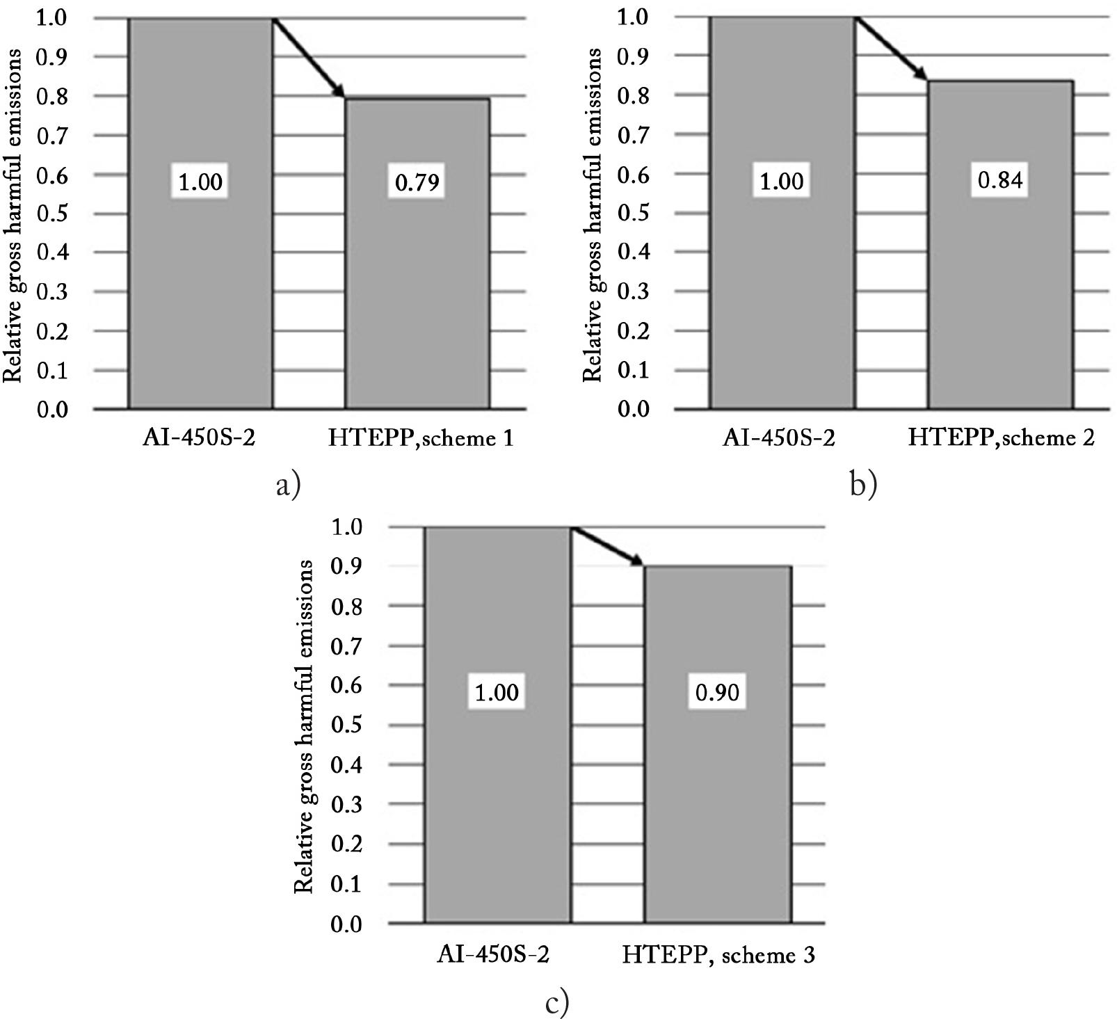 Comparative evaluation of gross harmful emissions for HTEPP configurations using energy Scheme 1 (a), Scheme 2 (b), Scheme 3 (c).