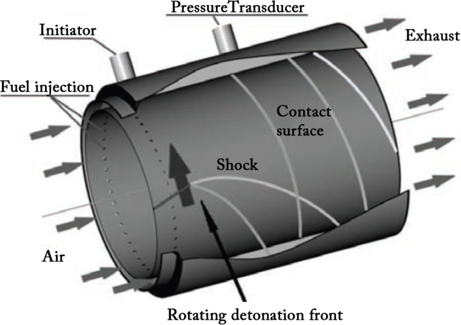 Various detonation chamber geometries have been proposed, among which the annular configuration is one of the most prominent. The geometry and flow field structure are illustrated in Fig. 1: the fuel and oxidizer are injected into an annular combustor and ignited, producing one or more rotating detonation waves. Although the inner wall of the combustor restricts the axial flow of reactants and helps ensure that most of the propellants undergo detonation – by preventing them from dispersing toward the engine center [12] – it also increases structural mass, complicates thermal management, and creates a central dead space.