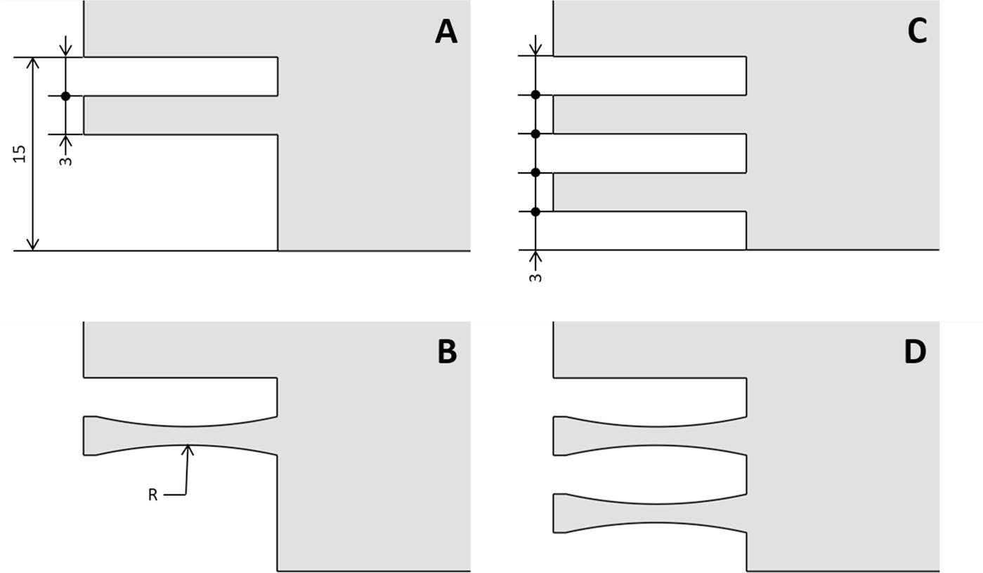 All engine configurations share the same fundamental dimensions: a 15 mm chamber radius, 15 mm nozzle length, and 3 mm wall thickness. Models B, D, and Dʹ incorporate a predefined curvature in the nozzle contour following a 1 mm straight inlet section.