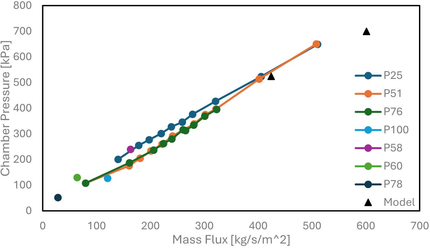 The chamber pressures were determined using experimental data from past studies [16–20]. Plotting the chamber pressures as a function of the mass flux of the engine (Fig. 4) shows that the chamber pressure falls within a linear band in relation to the mass flux. Based on this correlation, a chamber pressure of 700 kPa was selected for Models A, B, Cʹ and Dʹ, while 525 kPa was used for models C and D.