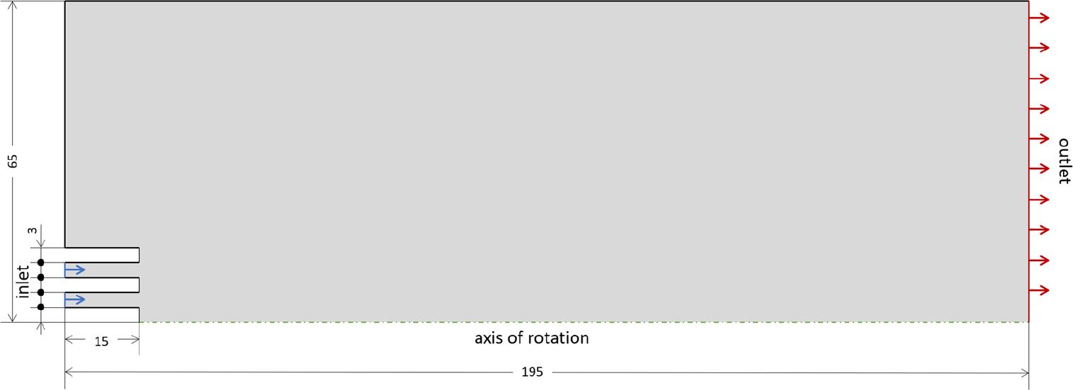 To identify the most effective design for thrust optimization and future three-dimensional modeling, two single-chamber configurations and four nested double-chamber configurations were developed and analyzed. The computational domain includes an engine positioned in the lower-left corner, with a base radius of 15 mm. The overall domain dimensions are 195 mm × 65 mm, extending 180 mm in the x-direction and 50 mm in the y-direction to allow detailed evaluation of the exhaust flow structure. The entire domain is defined with an axis of rotation along the bottom x-axis and is simulated as axisymmetric flow, consistent with the expected symmetry of the RDE exhaust downstream.