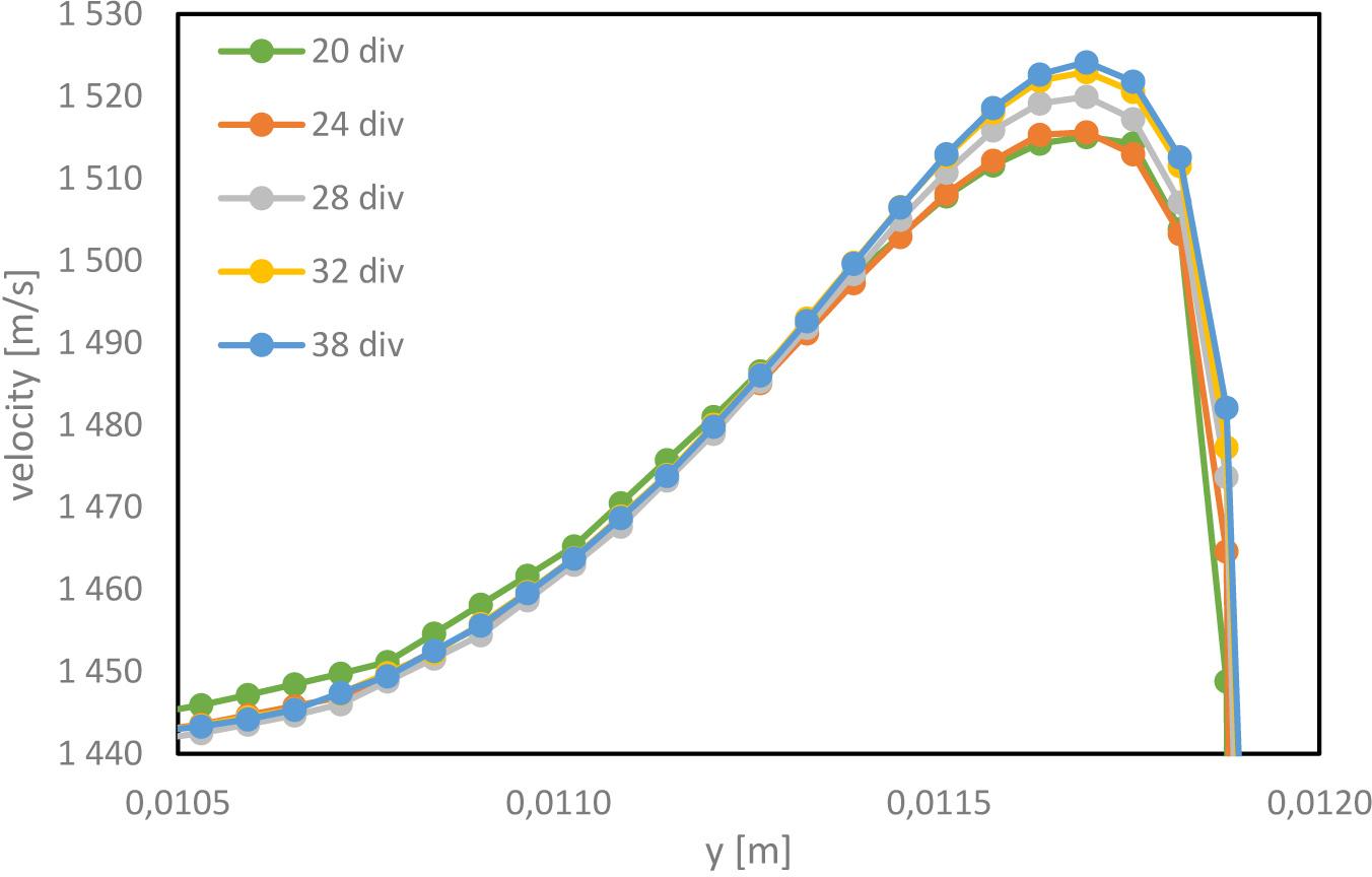 Figure 7 presents the mesh independence study, using velocity samples taken at the nozzle exit. The results show that differences between solutions decrease as the mesh is refined, particularly between the 32-division and 38-division cases. The 32-division mesh includes a minimum wall cell size of 0.01 mm. Since the variation between the 32- and 38-division meshes is minimal, the 32-division configuration was deemed sufficiently accurate. It was therefore selected for the study, providing an appropriate balance between computational accuracy and computational cost.