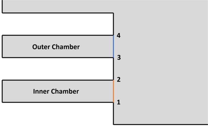 To ensure accurate thrust calculations, a systematic data acquisition strategy was implemented following the numerical simulations. Flow parameters such as density, static pressure, and velocity were recorded at the combustion chamber exits using two sampling lines: 1-2 (inner chamber) and 3-4 (outer chamber), as shown in Fig. 8. Each line was divided into 50 equally spaced points across the 3 mm chamber width, resulting in a 0.06 mm resolution, ensuring high-resolution measurements of local flow. This standardized sampling method was applied to all model variants, enabling direct performance comparisons.