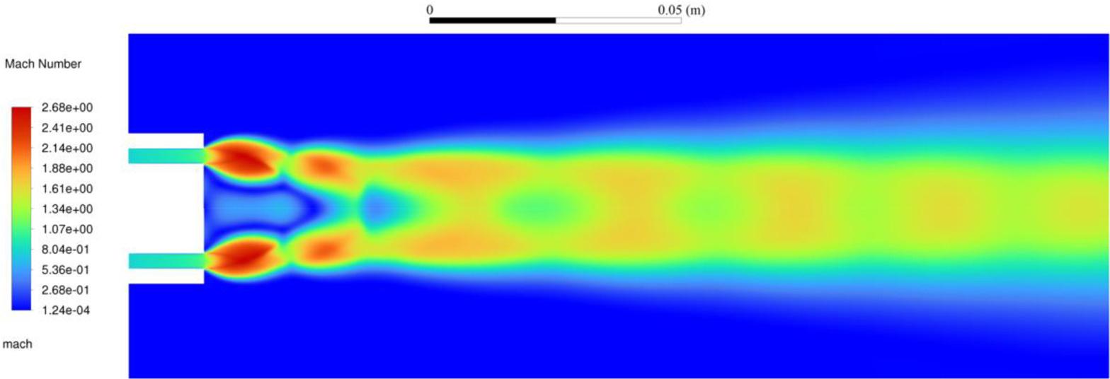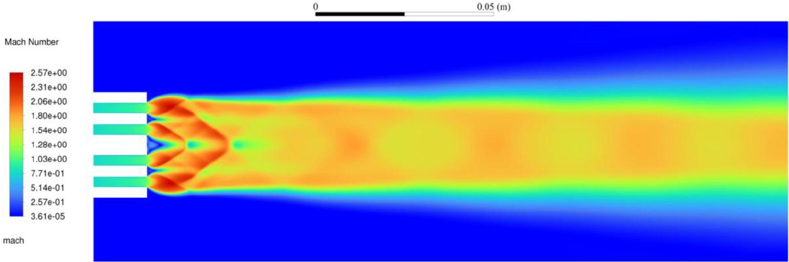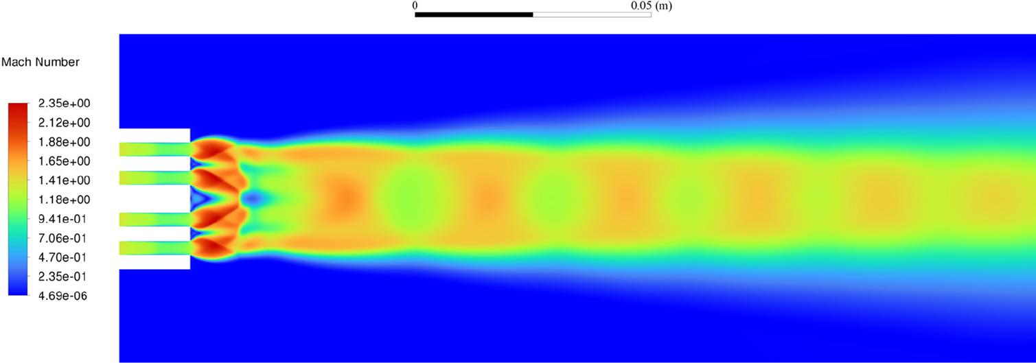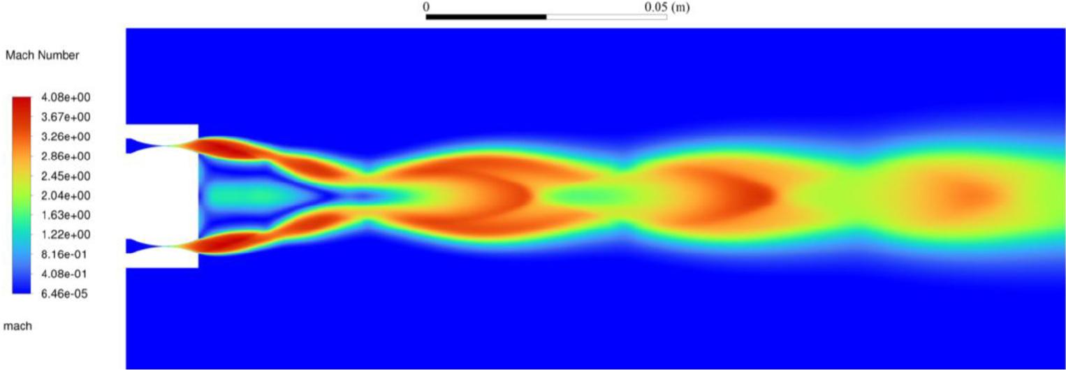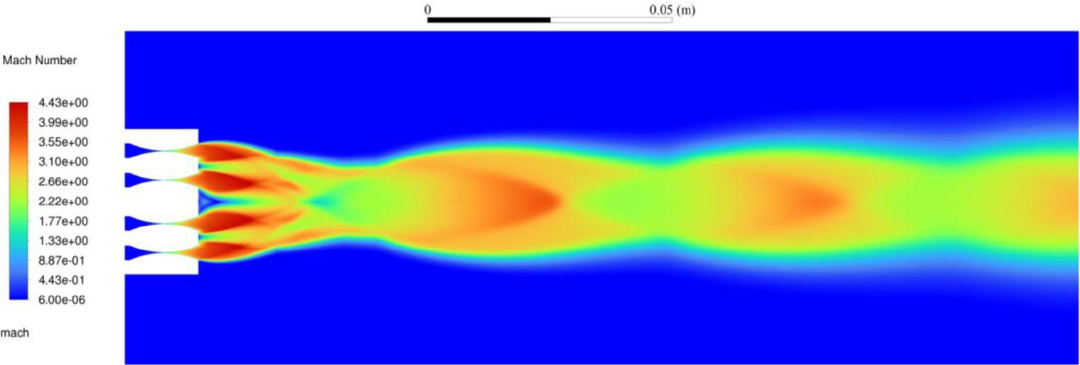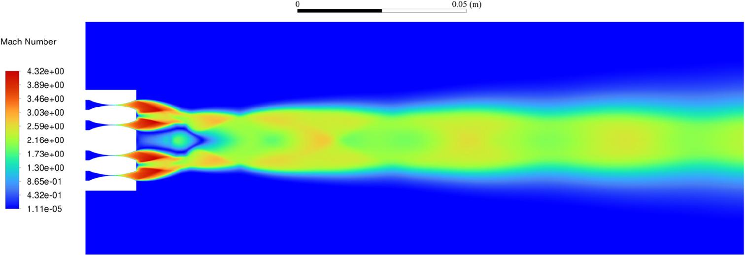 Figures 13 and 14 show the Mach number distributions for Models Cʹ and Dʹ. With a higher mass flow rate than Models C and D, each exhaust plume exhibits a stronger and more defined structure, leading to complex interactions in the merging region. The increased exit flow strength results in lower pressure at the center and between the chambers, causing the plumes to expand further downstream of the nozzle exit. Consequently, a smaller recirculation zone is observed in Model D' (Fig. 14). As expected, the plume structure is more pronounced than in Model D, and it transitions to a conventional exhaust structure earlier than in Model B.