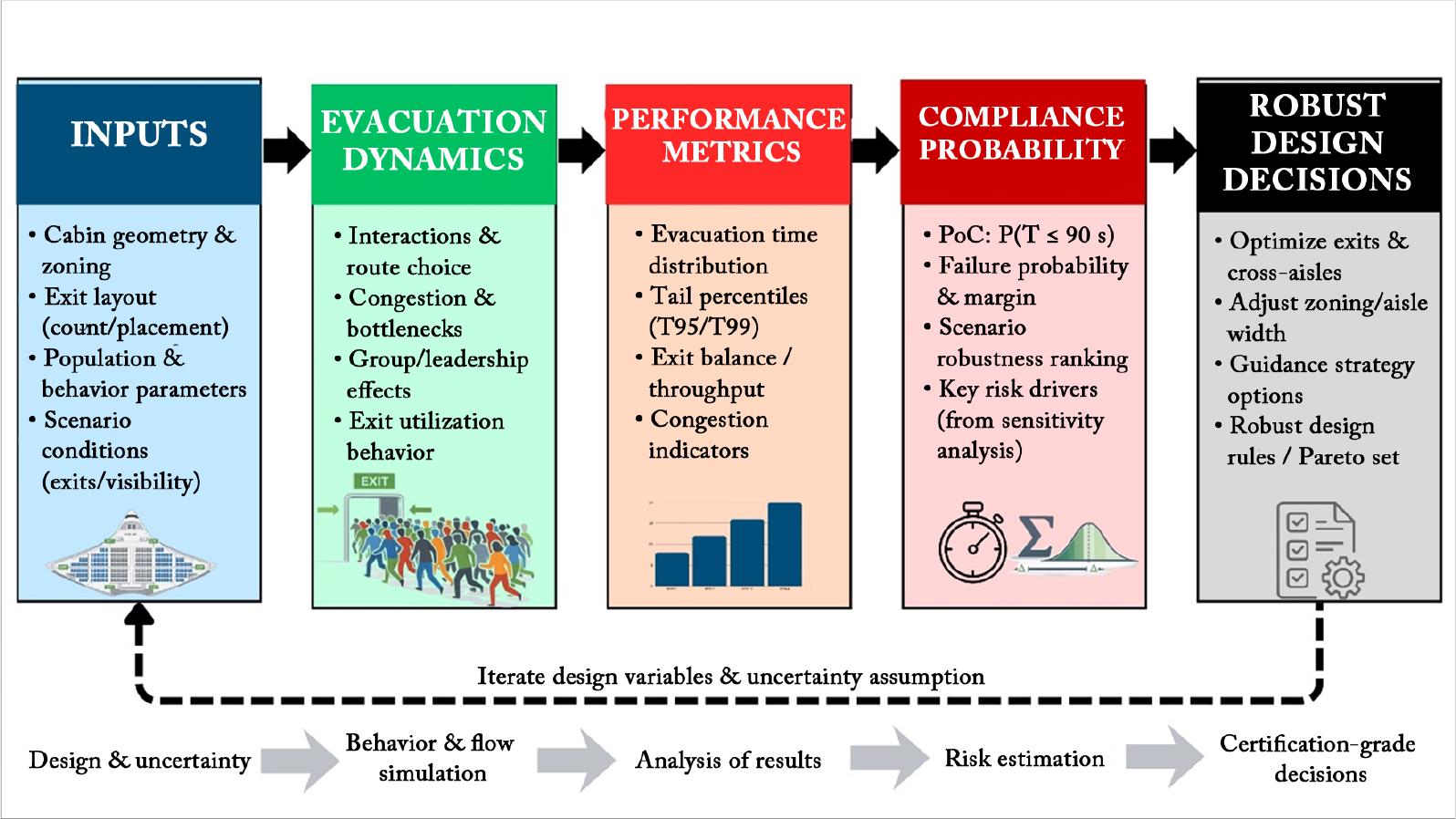 Against this background, a key limitation in evacuation modeling is that results are still often communicated as single-case predictions or narrow scenario comparisons, whereas certification decisions are inherently robustness decisions. Deterministic simulations can mask sensitivity to uncertainty in pre-movement time, walking speeds, exit-choice behavior, visibility, and exit availability – precisely the drivers that shift outcomes toward non-compliance. Safety-science work emphasizes evacuation analysis as an uncertain inference and decision-support problem, where unmodeled variability can lead to overconfident safety conclusions [11]. Although uncertainty propagation and sensitivity methods are increasingly used in safety-critical evacuation contexts, they are not yet consistently translated into certification-aligned evidence logic for aircraft cabin evacuation [12,13]. Three consequential gaps remain: (i) probability-of-compliance framing is limited, with many studies emphasizing mean evacuation time rather than threshold compliance likelihood under credible uncertainty [11]; (ii) traceability from assumptions to outputs to certification evidence is often weak, reducing auditability and decision utility [8,13]; and (iii) relatively few studies close the loop from uncertainty drivers to design levers – exit topology, cross-aisle structure, zoning, and operational guidance – so results directly support robust design choices rather than post hoc explanation [10].