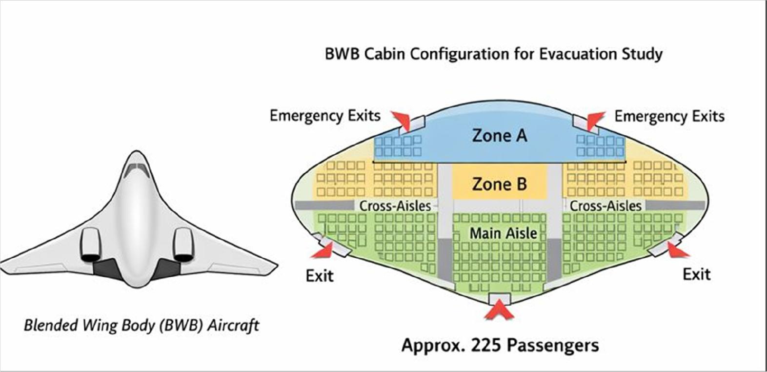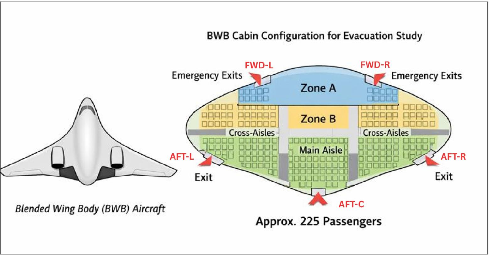 Trade-offs and cabin-architecture implications are central to the feasibility of passenger BWBs. The non-cylindrical cabin geometry can introduce disadvantages that offset perceived packaging benefits, including limited window access for many seats and potentially different motion cues at spanwise seat locations (e.g., higher vertical/lateral accelerations under roll dynamics). Safety and operations are also more challenging: emergency egress and ditching considerations become inherently more complex because passenger flow must redistribute laterally to reach perimeter exits under congestion and potential exit loss. These implications make evacuation performance a feasibility gate – not a secondary detail – and motivate robustness-oriented evaluation rather than reliance on nominal-layout timing.