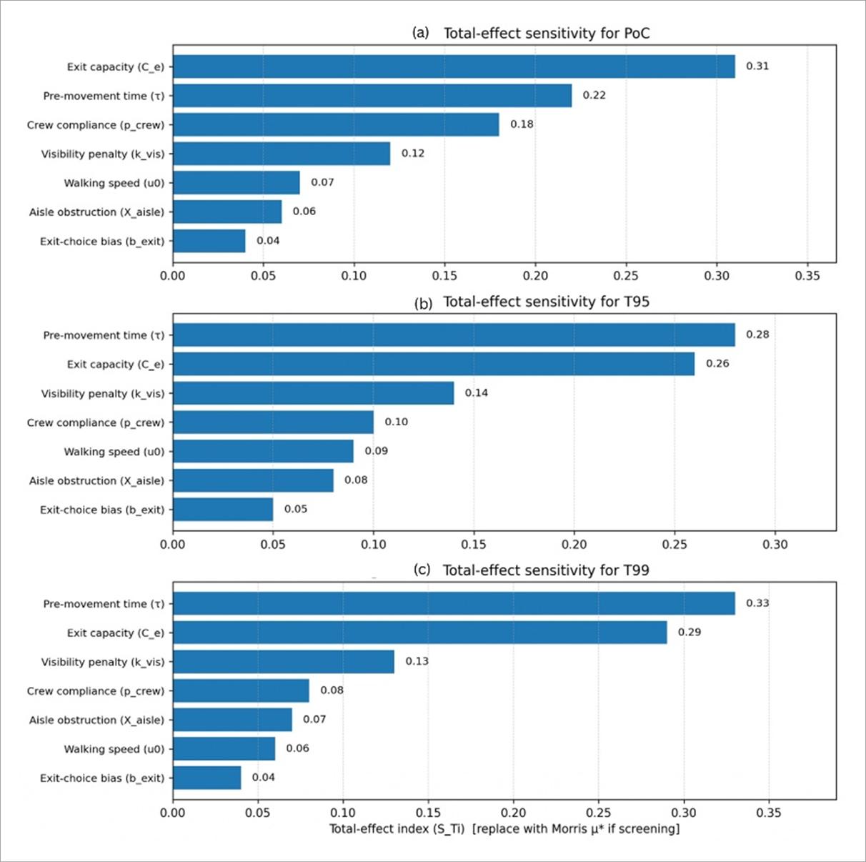Global sensitivity of evacuation robustness metrics under uncertainty (total-effect indices). (a) Total-effect sensitivity for compliance probability PoC; (b) total-effect sensitivity for T95; (c) total-effect sensitivity for T99.