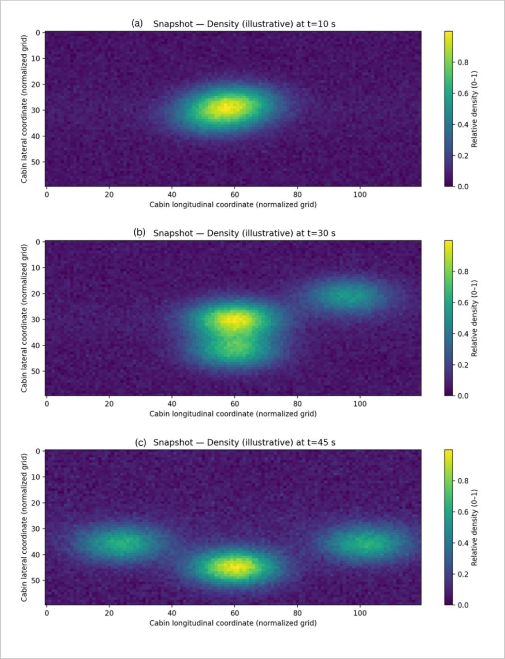 | S4 | Centerheavy loading | Baseline exits | Normal | Centerheavy (higher initial density in central cabin zones) | Nominal | Probes the wide-cabin redistribution burden and the sensitivity to merge formation. |