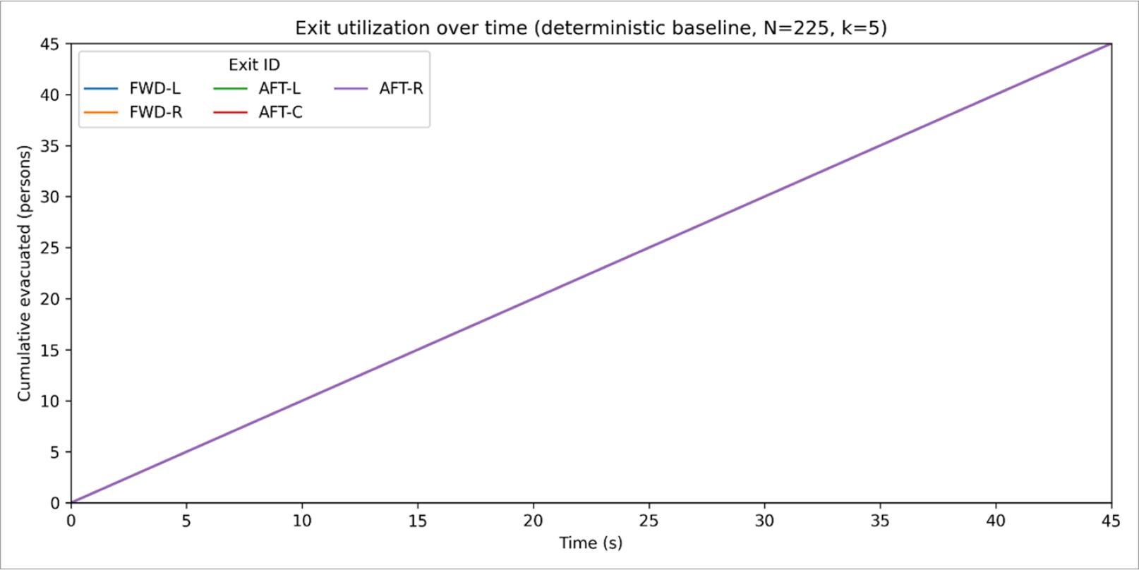 Under the deterministic reference assumptions, the baseline produces a stable evacuation completion time and an evenly distributed exit loading pattern, which together define the benchmark against which stressed and stochastic cases can be compared (Table 3). Exit use is balanced by construction in the baseline, yielding identical per-exit throughput totals and shares (Table 4). This balanced loading is reflected in the exit utilization curves in Figure 6, where cumulative evacuation trajectories are effectively parallel/overlapping across exits, indicating no preferential exit dominance in the reference configuration.
