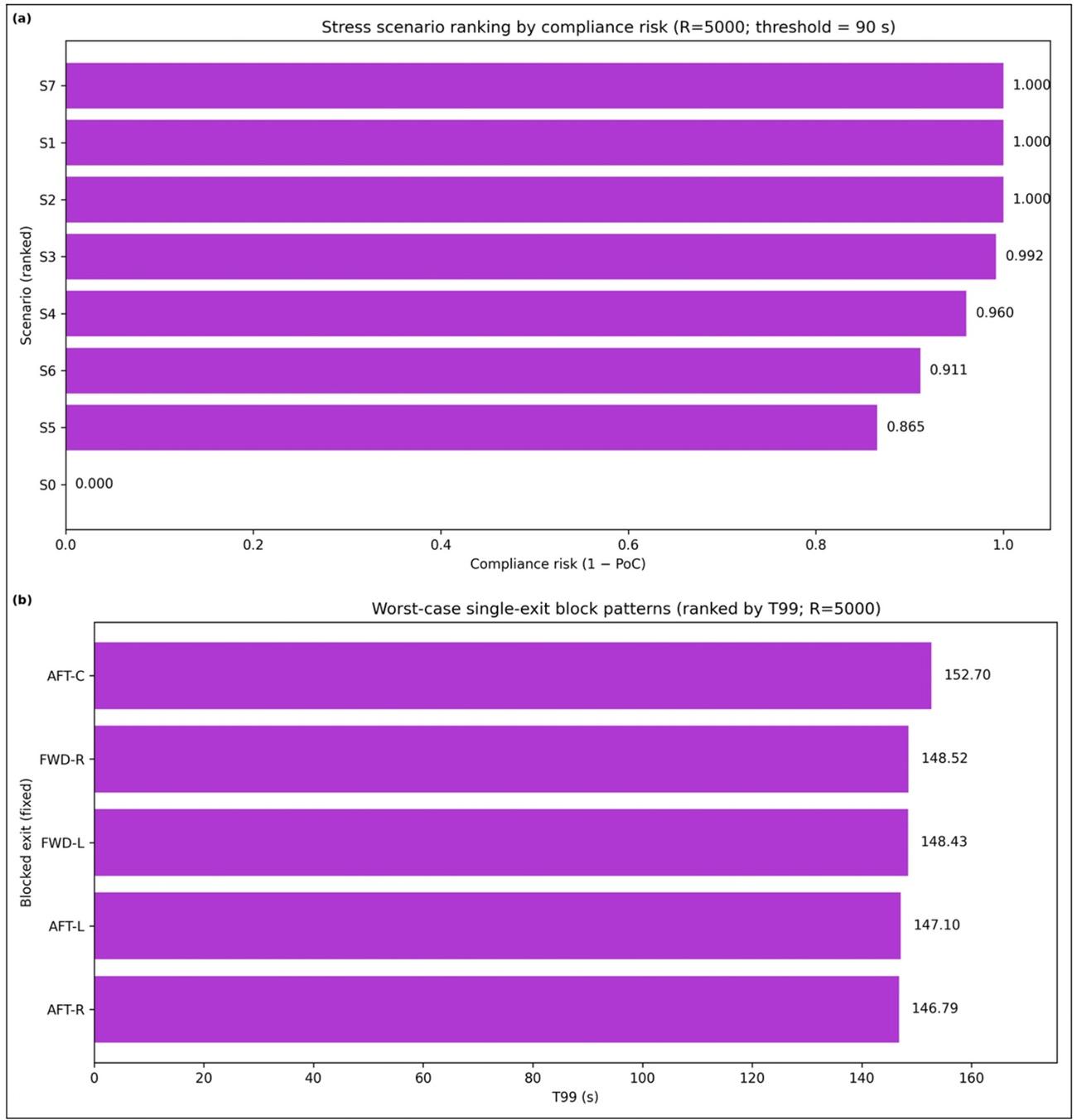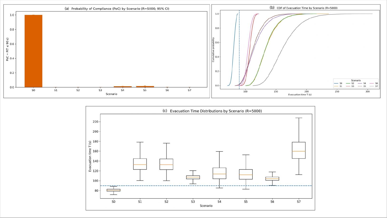 For regulators evaluating novel geometries, the present study implies an auditable model-evidence template: (1) a declared interpretation of the 90-s criterion and exit-availability mapping, (2) a scenario matrix including topology loss and compound stress, (3) uncertainty propagation reporting PoC + tail metrics (not only mean time), and (4) sensitivity/driver attribution showing what controls compliance outcomes – i.e., how often compliance holds, how severe exceedances are, and why failures occur.