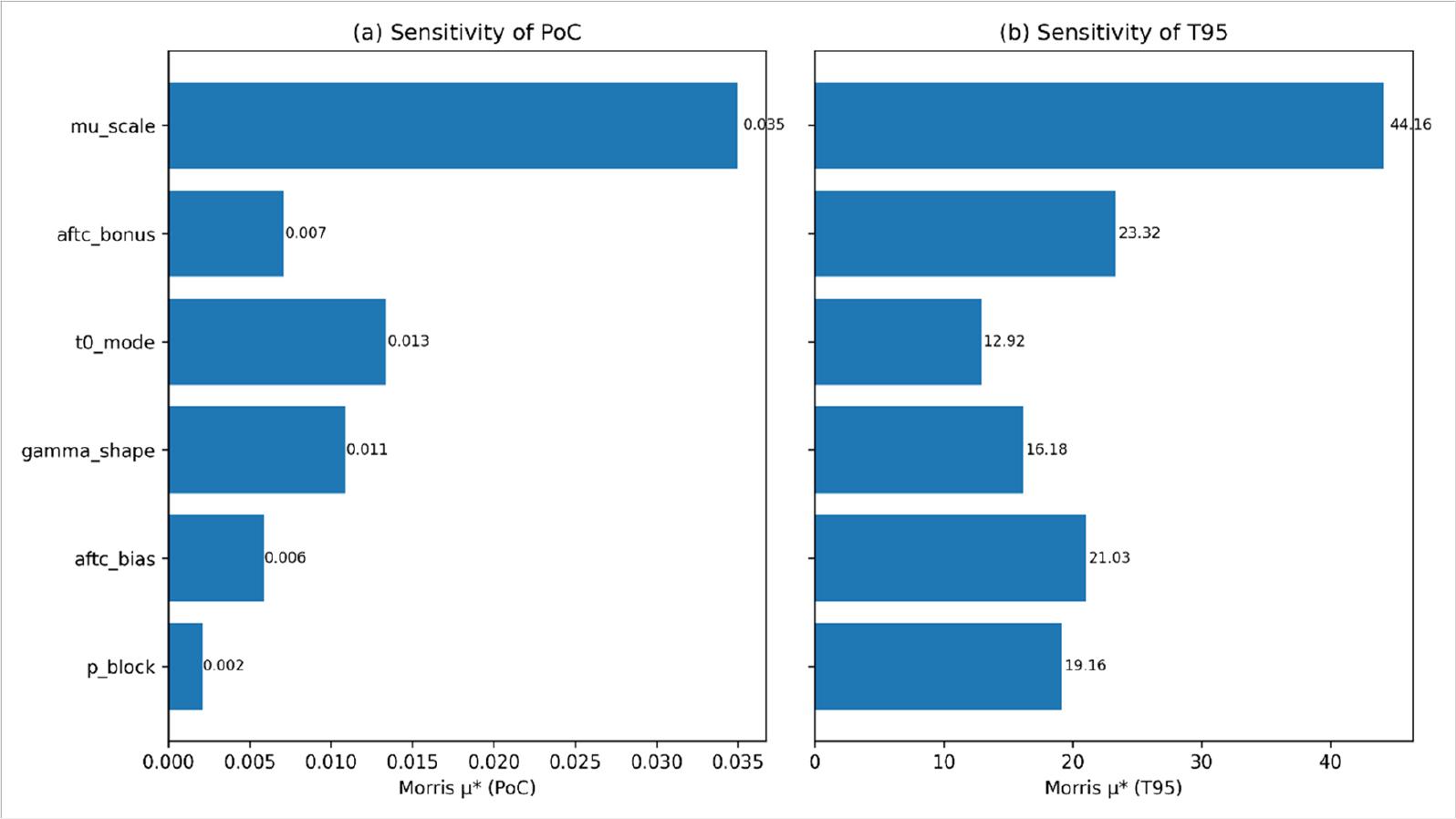 A global screening sensitivity analysis was performed using Morris elementary effects to identify which uncertain inputs most strongly influence (i) Probability-of-Compliance.