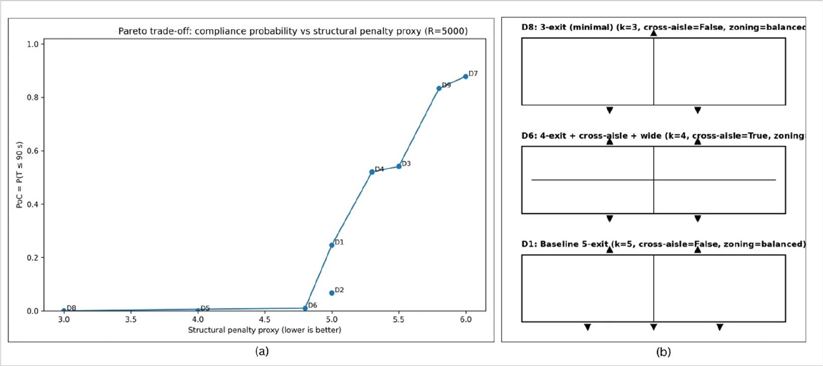Across the design trade space, the analysis indicates that evacuation robustness is governed primarily by structural bottlenecks and demand imbalance, rather than by marginal changes in nominal walking speed. Designs that increase effective discharge capacity and/or improve exit-loading balance consistently recover compliance margin and reduce tail growth. In particular, cross-aisle redistribution behaves like a robustness amplifier (enabling rerouting under local saturation), while capacity-preserving geometry (e.g., wider aisles/door-area throughput improvements) can deliver substantial PoC gains without simply “adding exits.”