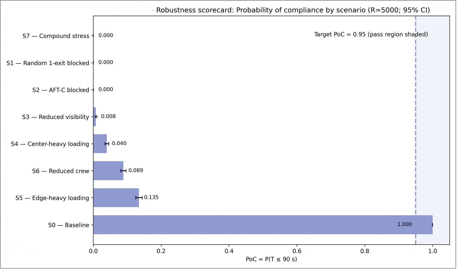 The certification-style scorecard shows a sharp separation between nominal and stressed performance across S0–S7 when judged by compliance likelihood PoC = P(T ≤ 90 s) and tail severity (T95 – T99) (Table 10; Figure 11). Baseline S0 is effectively assured (PoC ≈ 1.000, tight CI) with tails well below 90 s, indicating a robust buffer. The dominant robustness threats are capacity/topology disruptions: exit-loss (S1 random 1-exit blocked; S2 AFT-C blocked) and compound stress (S7) collapse to PoC ≈ 0.000 with T95 – T99 far beyond 90 s, consistent with structurally constrained discharge under the current topology/capacity envelope (Table 10; Figure 11). These cases require design-level mitigation (exit redundancy, cross-aisle redistribution, capacity-preserving aisle/door-area geometry), not parameter tuning.