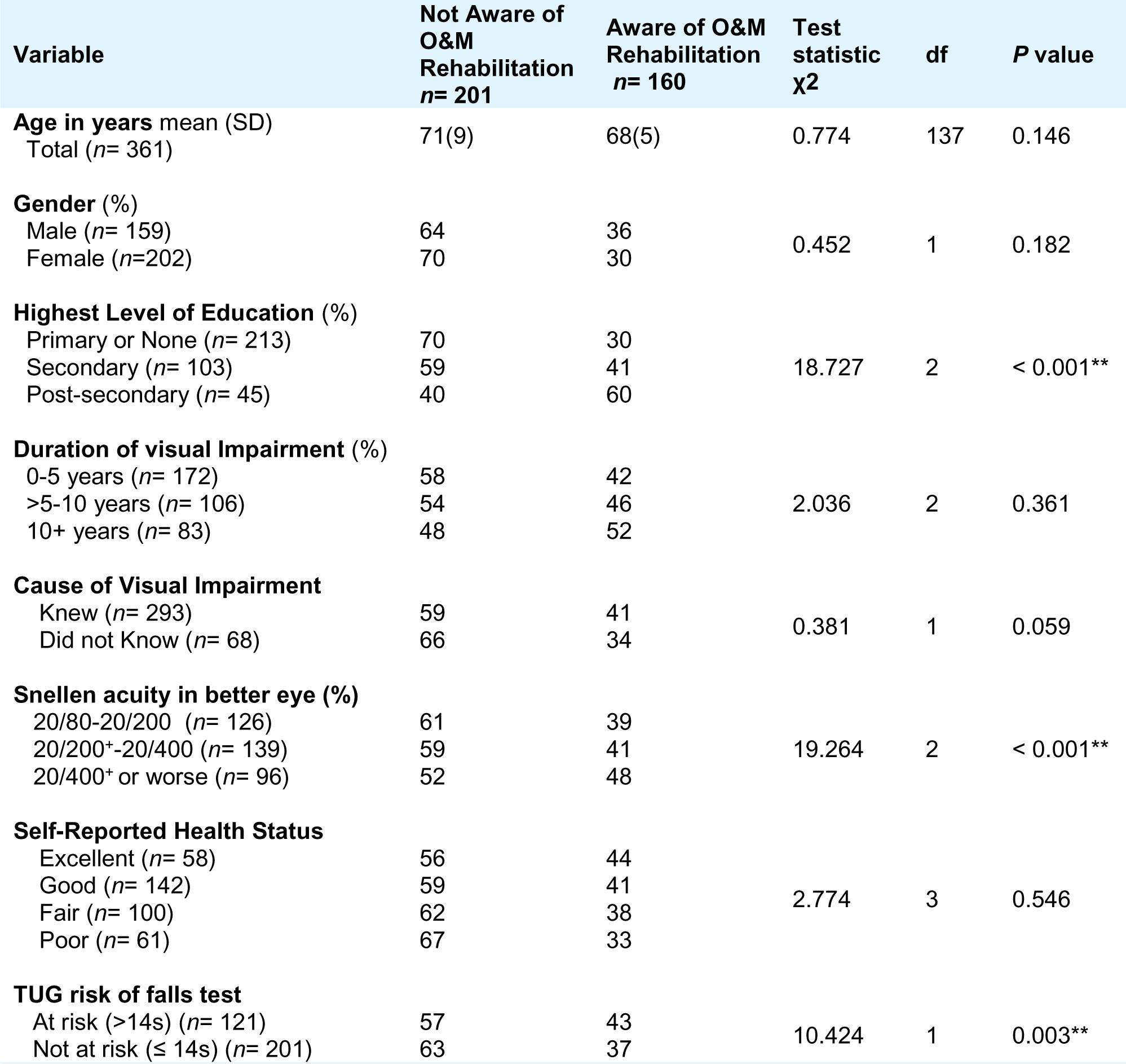 The two primary outcomes for this analysis include: first, awareness of orientation and mobility (O & M) rehabilitation training (yes, no) and, second, among those who indicated that they were aware of O & M rehabilitation training, any previous participation or attendance in O & M rehabilitation (yes, no). Statistical analysis to ascertain the degree of differences in demographic, visual, health, and TUG risk of falls test outcomes were conducted among participants who were aware of O & M services as well as in those who were not. Pearson’s χ2 tests and t-tests were used to investigate for variables that had significant effects. Among those who indicated awareness of O & M rehabilitation training, differences in demographic, visual, health, and risk of falls-related variables were examined in those who had participated in O & M rehabilitation training and in those who never did. Pearson’s χ2 tests and t-tests were repeated and variables that demonstrated statistical significance in t-tests and Pearson’s χ2 tests were included for computation using multiple logistic regression models to determine independent relationships. These computations considered an alpha level of 0.05 as being statistically significant.
