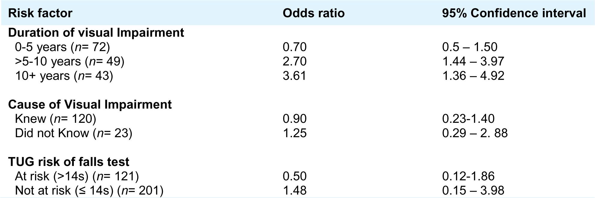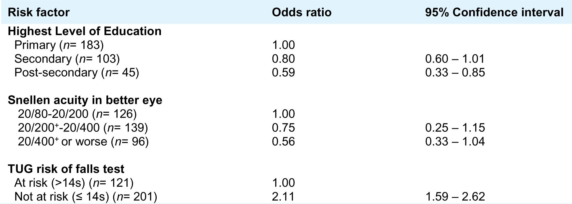 Less than half (160 participants (44%) of 361) knew about Orientation and Mobility Rehabilitation Services (OMRS). Only 26.88% (43 participants) of those who were aware of OMRS, reported accessing the service. Education was the only demographic variable that was related to awareness of OMRS (Table 2). Participants who knew the cause of their sight loss were, on borderline statistical significance, more aware of low-vision services compared with those who did not know the cause of their visual impairment (41% vs 34%, χ2= 0.381, df=1, p=0.059). Also, those whose visual acuity was 20/400+ or worse were more aware of OMRS compared to other participants with visual acuities between 20/80 and 20/400 (48%, χ2= 19.264, df= 2, p<0.001). Age, gender, duration of visual impairment, and self-reported health status were not associated with awareness of orientation and mobility rehabilitation services (Table 2). A total of 201 participants completed the TUG test within 14 seconds. Thirty-nine (39) participants did not take the TUG test for various reasons ranging from not agreeing to participate in that part of the study in order not to risk falling, inability to walk unaided with a walking stick or wheelchair, having a broken leg, arthritis, and having recently gone through a hip, leg, or ankle surgery. Based on the TUG test scores, 121 participants took longer than 14 seconds to complete the test and were identified as being at risk of falling. Participants who were at risk of falls, based on the Timed Up and Go (TUG) test exceeding 14 seconds, were more aware of ORMS (43% vs 37%, χ2= 10.242, df= 1, p=0.03). To further investigate which variables were independently associated with awareness of OMRS, multiple-logistic regression analysis was conducted by entering statistically significant variables in the preliminary analysis as shown in Table 3.
