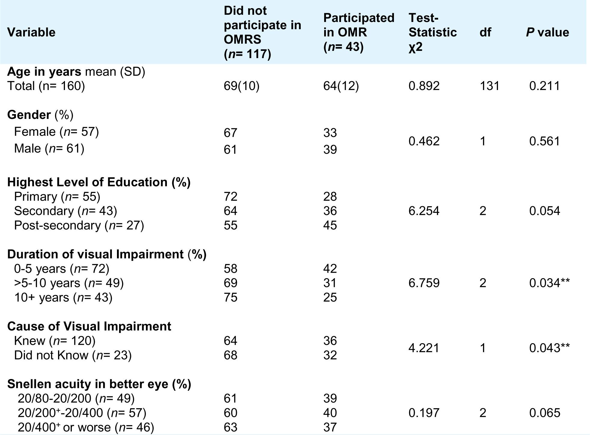 Participants with post-secondary education (odds ratio [OR] 0.59, 95% Confidence Interval [CI] 0.33 – 0.85) and those with visual acuity worse than 20/400 (odds ratio [OR] 0.56, 95% Confidence Interval [CI] 0.33 – 1.04) were least likely to be unaware of OMRS. Participants who were not at risk of falling were twice likely to be unaware of OMRS as those with risk of falling (odds ratio [OR] 2.11, 95% Confidence Interval [CI] 1.59 – 2.62). Among participants who were aware of OMRS, only 26% (n=43) participated in OMRS (Table 4).