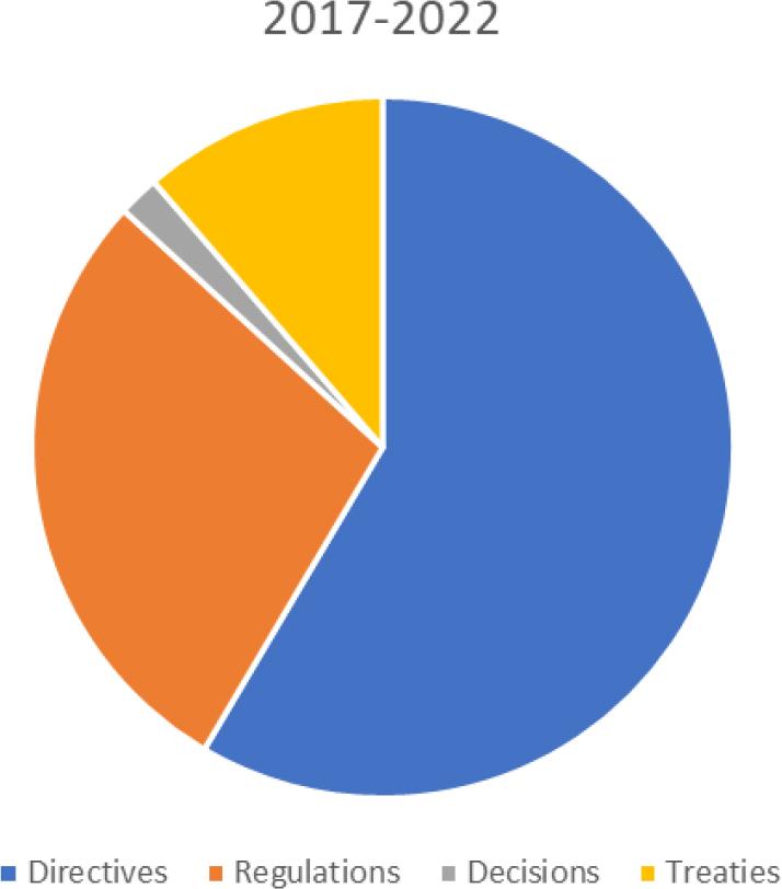 These include basic and amending acts adopted by the European Parliament and Council, Council regulations, delegated acts of the Commission and implementing acts of the Commission or Council. Source: https://eur-lex.europa.eu/statistics/2022/legislative-acts-statistics.html?locale=en.