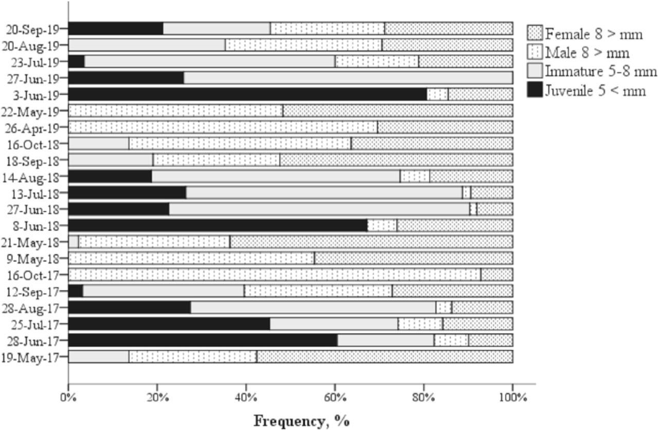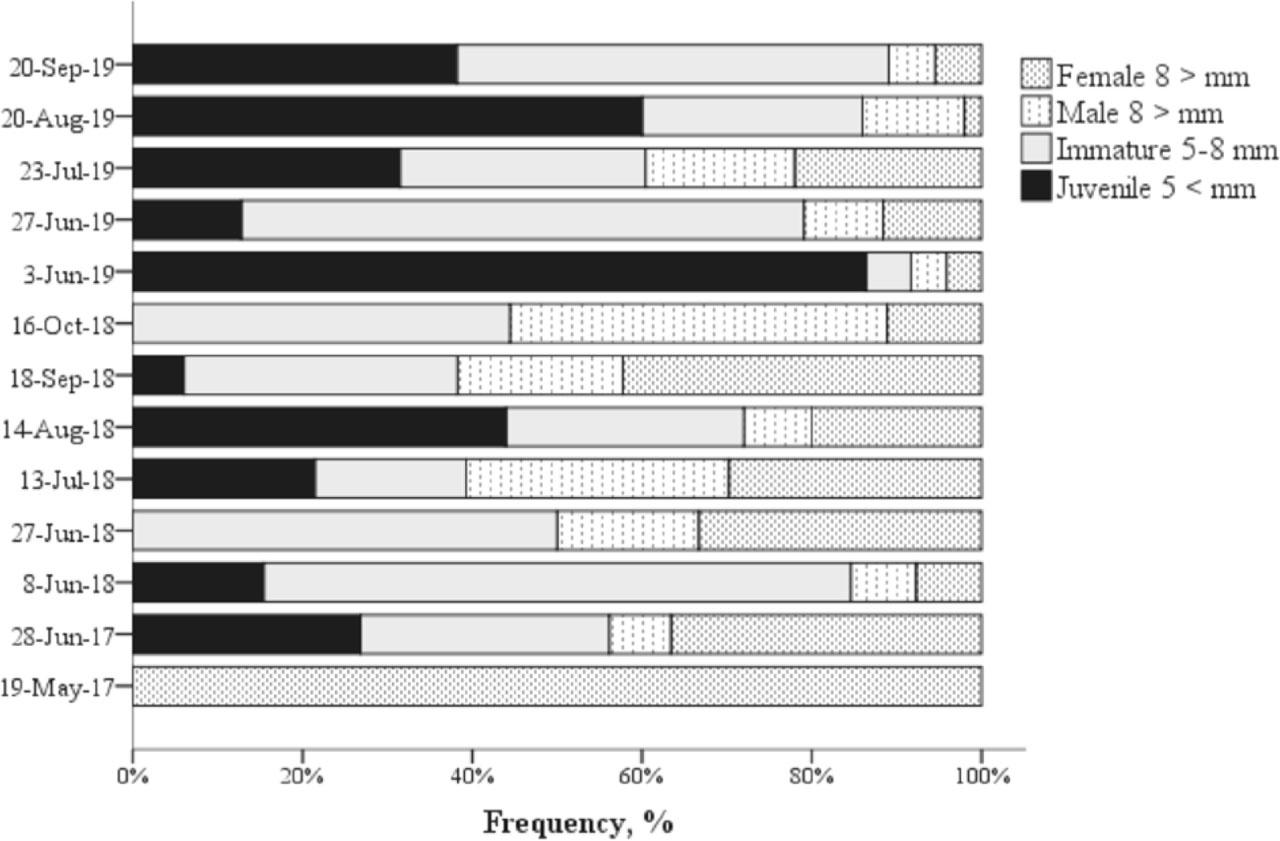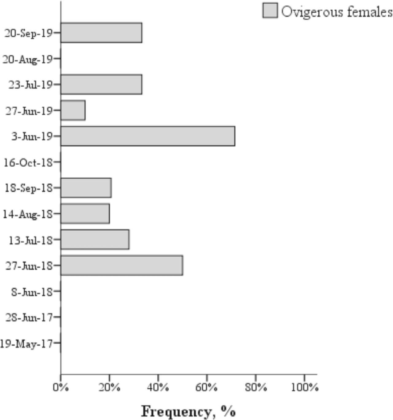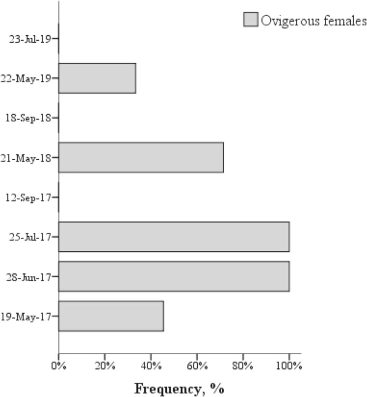 | Average size of ovigerous females, mm | - | 11.6 ± 1.3 SD | 10.9 ± 1.5 SD |